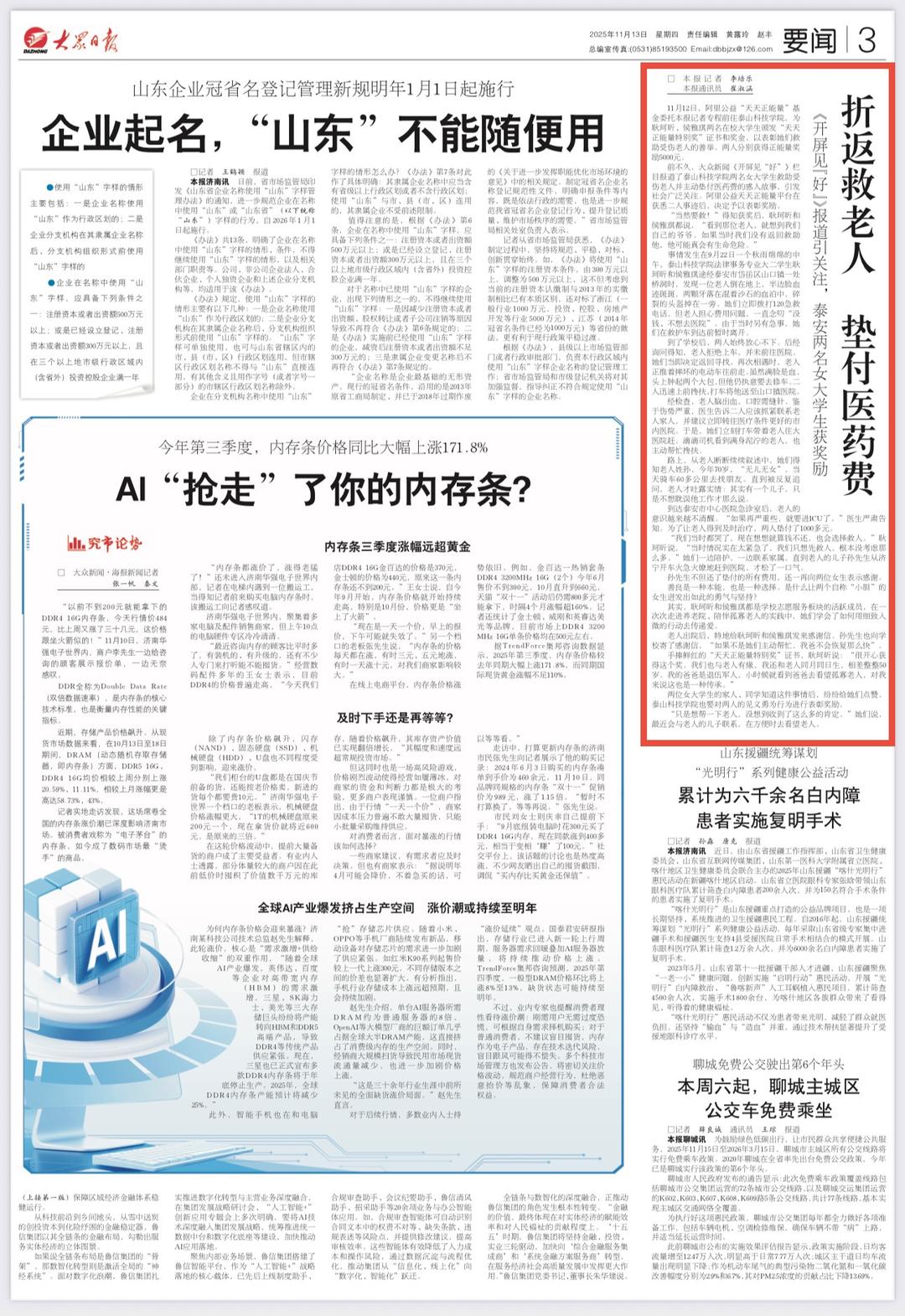 11月13日,3版要闻刊发《折返救老人 垫付医药费》,报道泰安泰山科技学院两名女大学生救助老人感人事迹。详情请点击这里—
