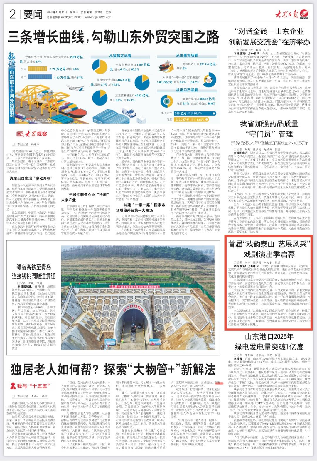 11月11日,2版要闻刊发《首届“戏韵泰山 艺展风采”戏剧演出季启幕》,报道泰安首届“戏韵泰山 艺展风采”戏剧演出季在泰山大剧院启幕。详情请点击这里—