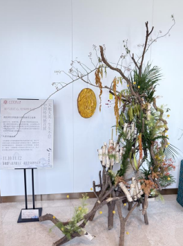 除了在花材的选用上体现生生不息的核心理念,花艺师的代际传承也同样印证着这一点。参与布展的花艺师来自不同高校、组织,每个人接触插花的年限也各不相同。后起新秀学习着优秀前辈的样子插花、造景,技艺从最初的青涩、无固定范式,到后来的成熟、形成属于自己的插花习惯。倪贵美说,虽然在插花的学习过程中有教材和老师指导,但到花艺实操环节,老师放手让她们造“无可名之形”,就手足无措了。这一理念来自中国古代道家代表人物老子,现如今仍然被运用在插花技艺中,参悟这句话是成为一名合格的花艺师的必经之路。