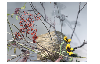 中医理论中,事物总是相对的,如“阴与阳”“虚与实”“枯与荣”。倪贵美敏锐捕捉到这一特征,并创作出数组作品。“枯与荣”的相关作品中,倪贵美使用了接骨草,它的一大特点就是有时同一枝叶上能见到正盛开的花序、新鲜果子与干枯的花同时存在,中下部的向日葵也为了配合主题做了处理,揪掉一些花瓣做成了并不完美的样子,底部选取红星凤梨,代表蓬勃的生机。整幅作品寓意着所有的看似衰败、凋零、死亡的背后其实都蕴藏着新生,就像是秋冬飘落的花瓣和树叶都将化为土壤里的养分,滋养着枝干,等待来年春天的又一轮生发。