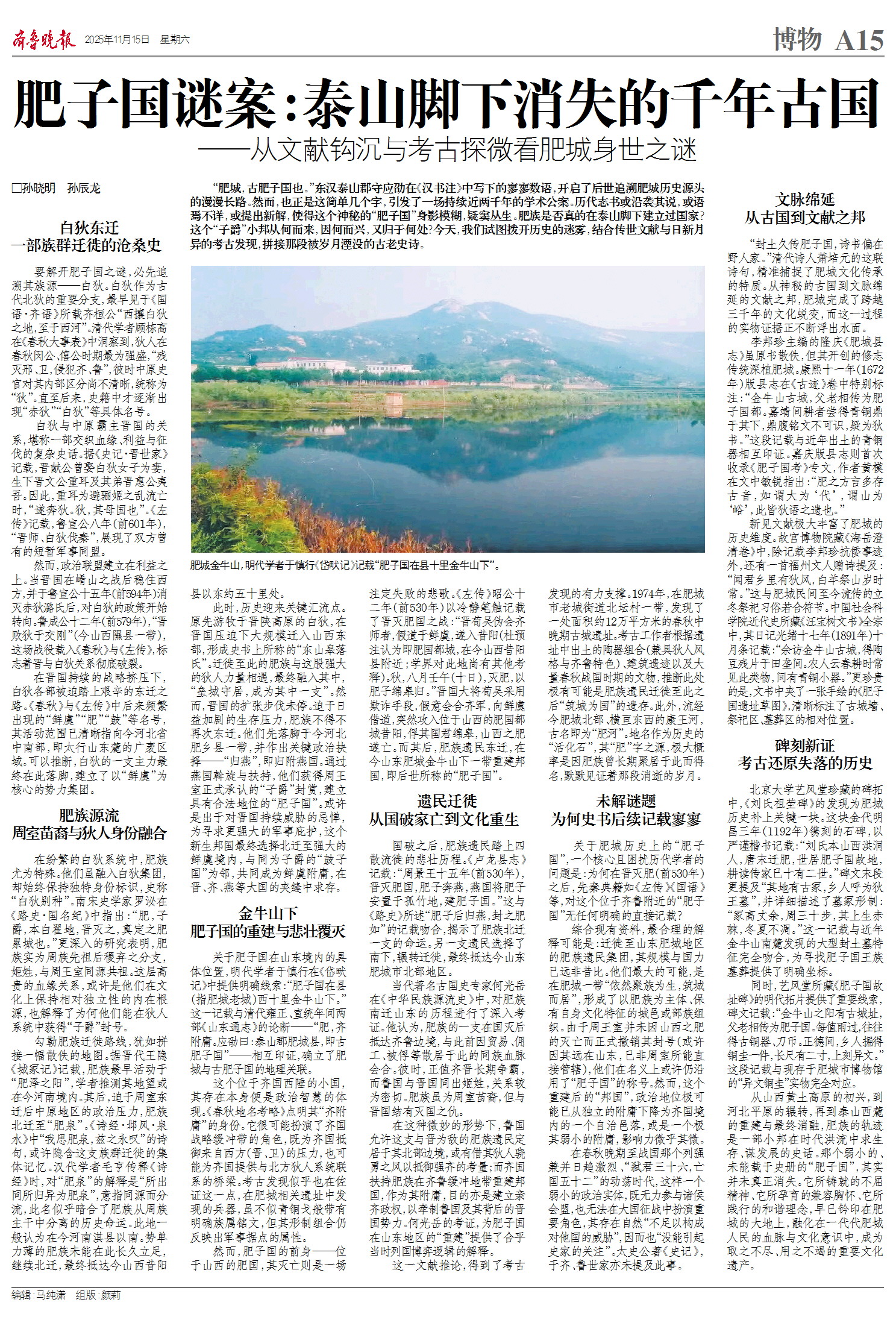从山西黄土高原的初兴,到河北平原的辗转,再到泰山西麓的重建与最终消融,肥族的轨迹是一部小邦在时代洪流中求生存、谋发展的史话。那个弱小的、未能载于史册的“肥子国”,其实并未真正消失。它所铸就的不屈精神、它所孕育的兼容胸怀、它所践行的和谐理念,早已钤印在肥城的大地上,融化在一代代肥城人民的血脉与文化意识中,成为取之不尽、用之不竭的重要文化遗产。