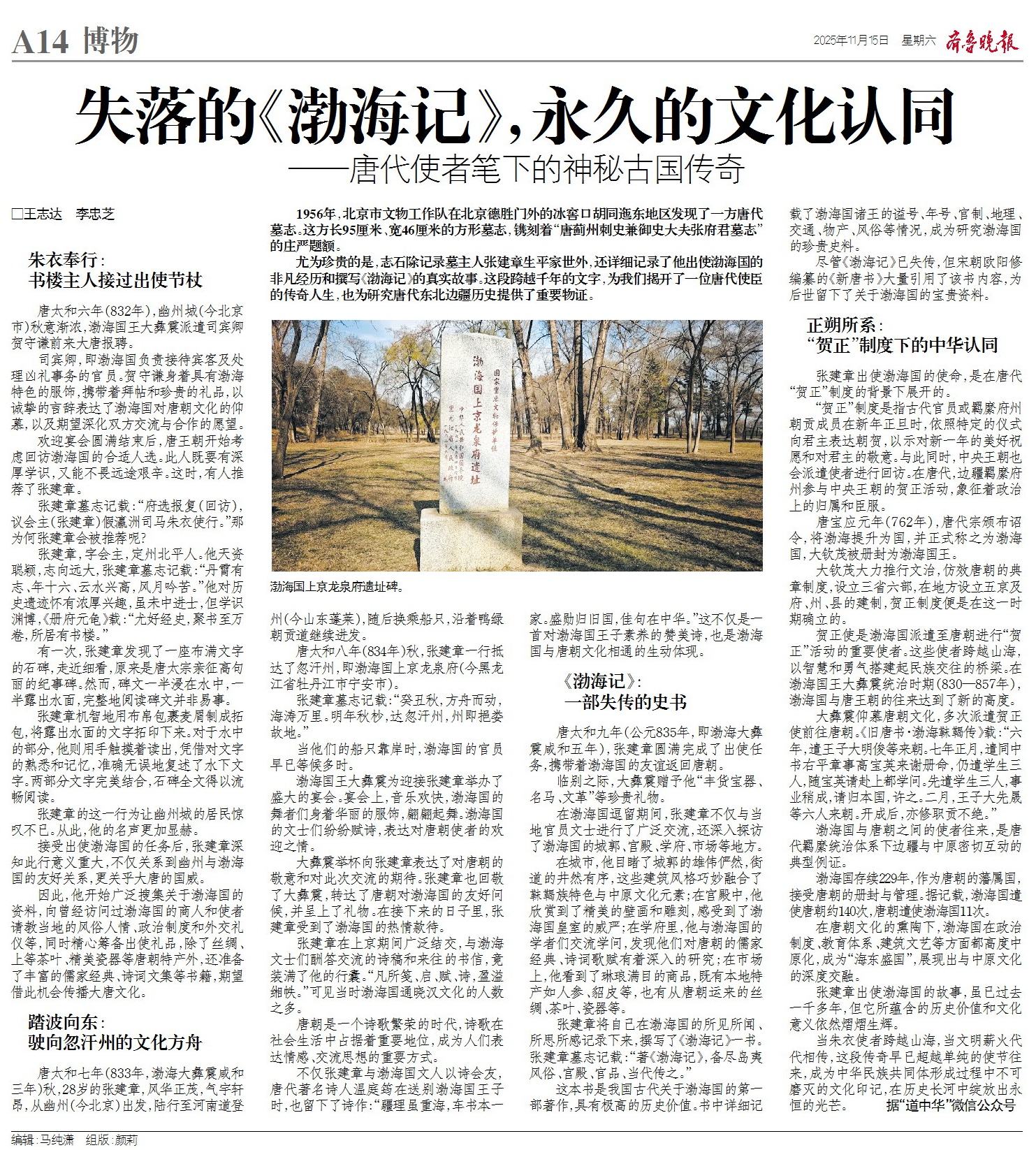 尤为珍贵的是,志石除记录墓主人张建章生平家世外,还详细记录了他出使渤海国的非凡经历和撰写《渤海记》的真实故事。这段跨越千年的文字,为我们揭开了一位唐代使臣的传奇人生,也为研究唐代东北边疆历史提供了重要物证。