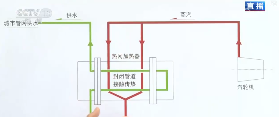 这热能是怎么传递的?图中红色部分代表的是高温蒸汽,而绿色部分则是城市供热管网中的热水。高压的蒸汽和城市供热水管不直接接触,是通过中间的热网加热器间接传热,也就是通过换热站把高温蒸汽的热量传递给家中的暖气管,也保证了居民供暖的安全。