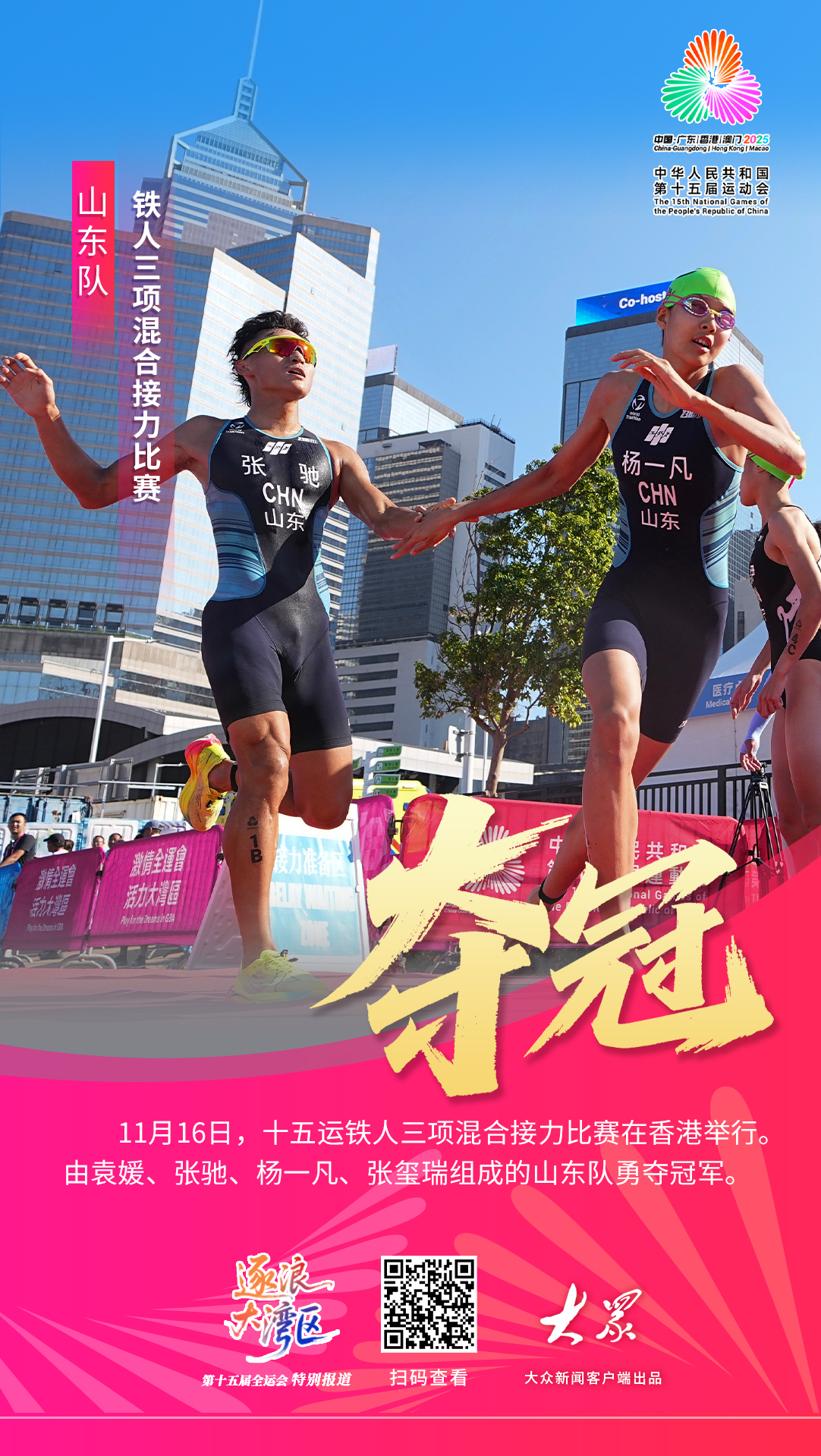 今天(11月16日),十五运铁人三项混合接力比赛在香港举行。由袁媛、张驰、杨一凡、张玺瑞组成的山东队拼尽全力,最终获得冠军。为山东代表团再添一枚金牌。