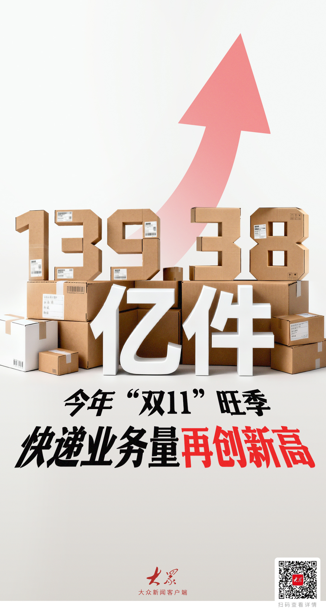 国家邮政局监测数据显示,10月21日至11月11日,全国邮政快递企业共揽收快递包裹139.38亿件,其间日均揽收量达6.34亿件,是日常业务量的117.8%。旺季单日业务量峰值达7.77亿件,刷新单日业务量纪录。