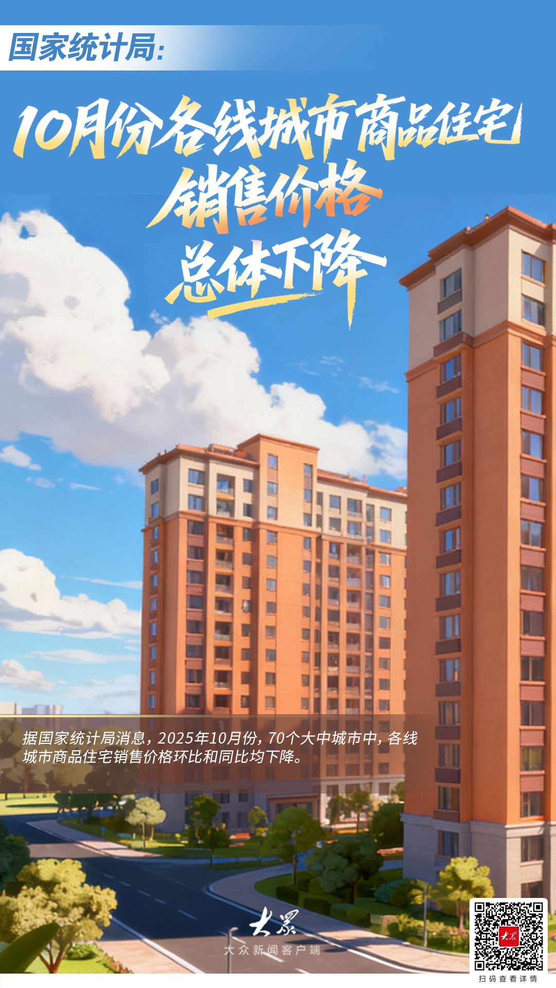 据国家统计局消息,2025年10月份,70个大中城市中,各线城市商品住宅销售价格环比和同比均下降。