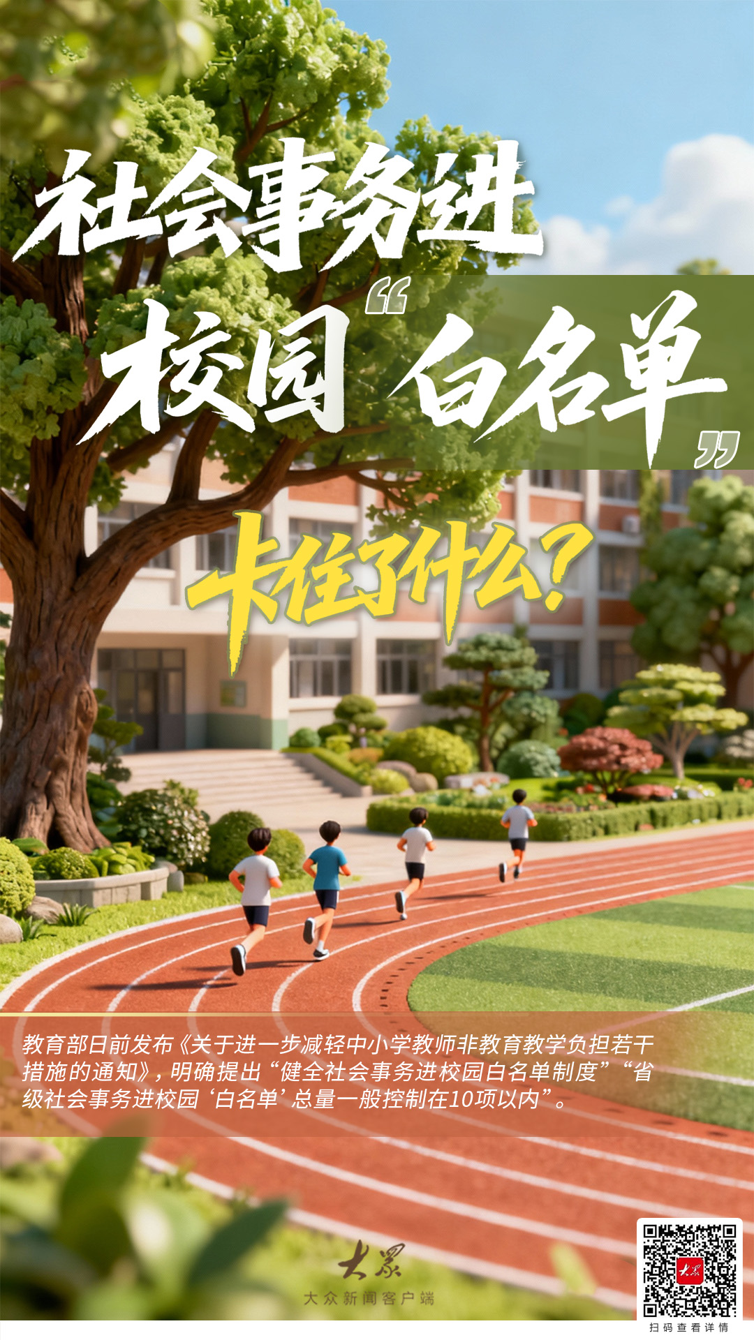 教育部日前发布《关于进一步减轻中小学教师非教育教学负担若干措施的通知》,明确提出“健全社会事务进校园白名单制度”“省级社会事务进校园‘白名单’总量一般控制在10项以内”。
