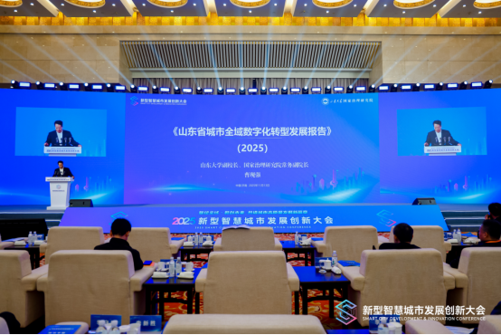 山东大学国家治理研究院在大会上发布了《山东省城市全域数字化转型发展报告(2025)》。报告系统梳理了山东省在城市数字经济、数字化服务、数字化治理、智慧社区建设、数字化转型支撑与生态等六大核心领域的创新实践与发展水平。