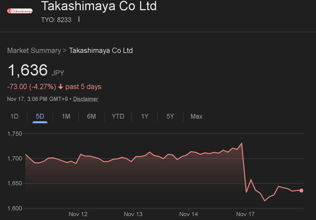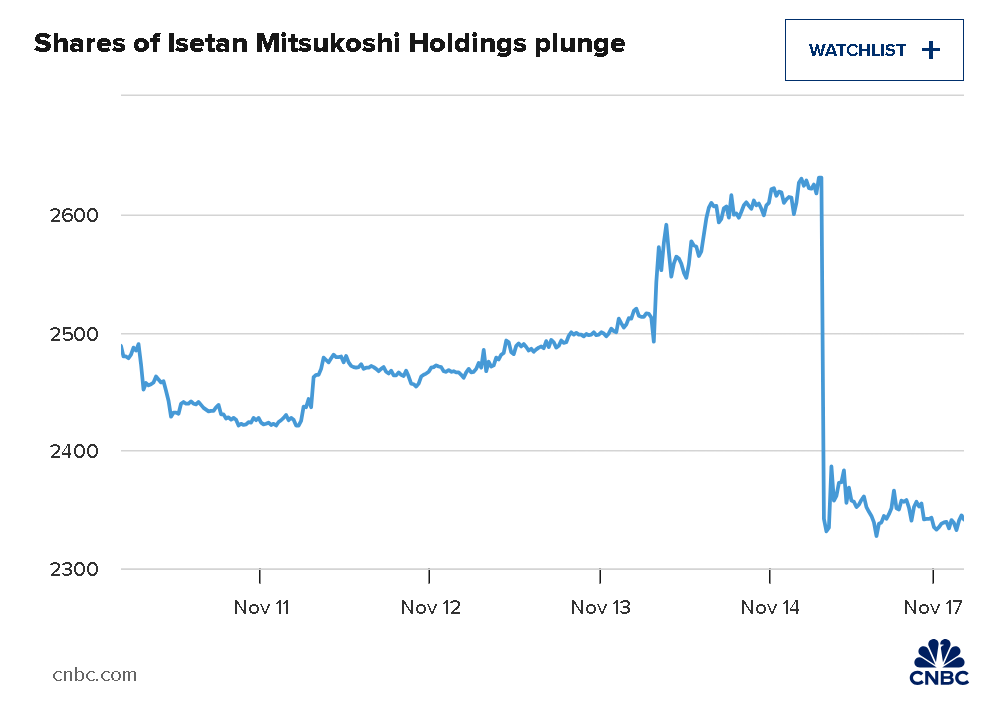 同样遭遇股价断崖式下跌的还有资生堂的母公司三越伊势丹控股,甚至从CNBC给出的股价走势图来看,该公司的股价下跌几乎呈现出“自由落体”,跌幅一度超10%。