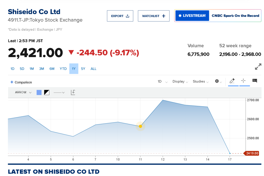 这家美国财经类媒体给出的日本资生堂的股价走势图更是直观地显示,自14日起,这家日本企业的股价出现了断崖式的下跌。