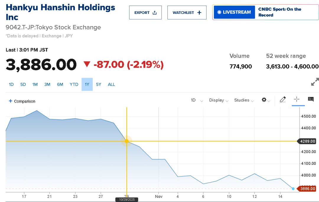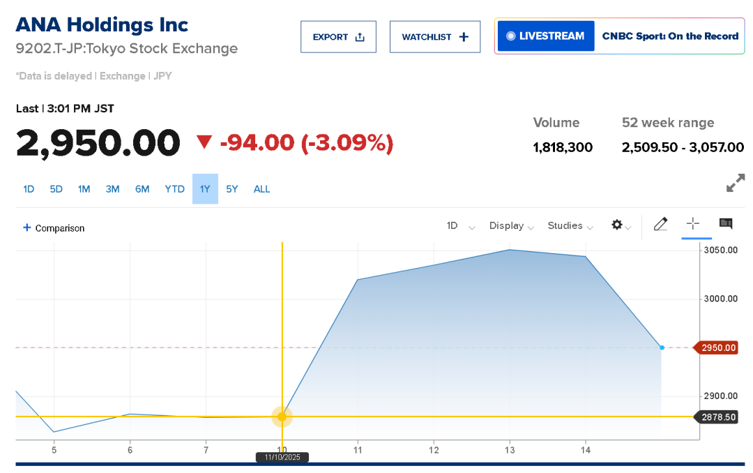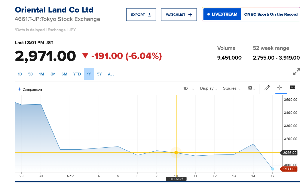 此外,东京迪士尼的运营公司东方乐园株式会社、日本航空业的全日空控股、日本铁路运输和零售旅馆业的阪急阪神控股,亦出现了较大幅度的股价下跌。