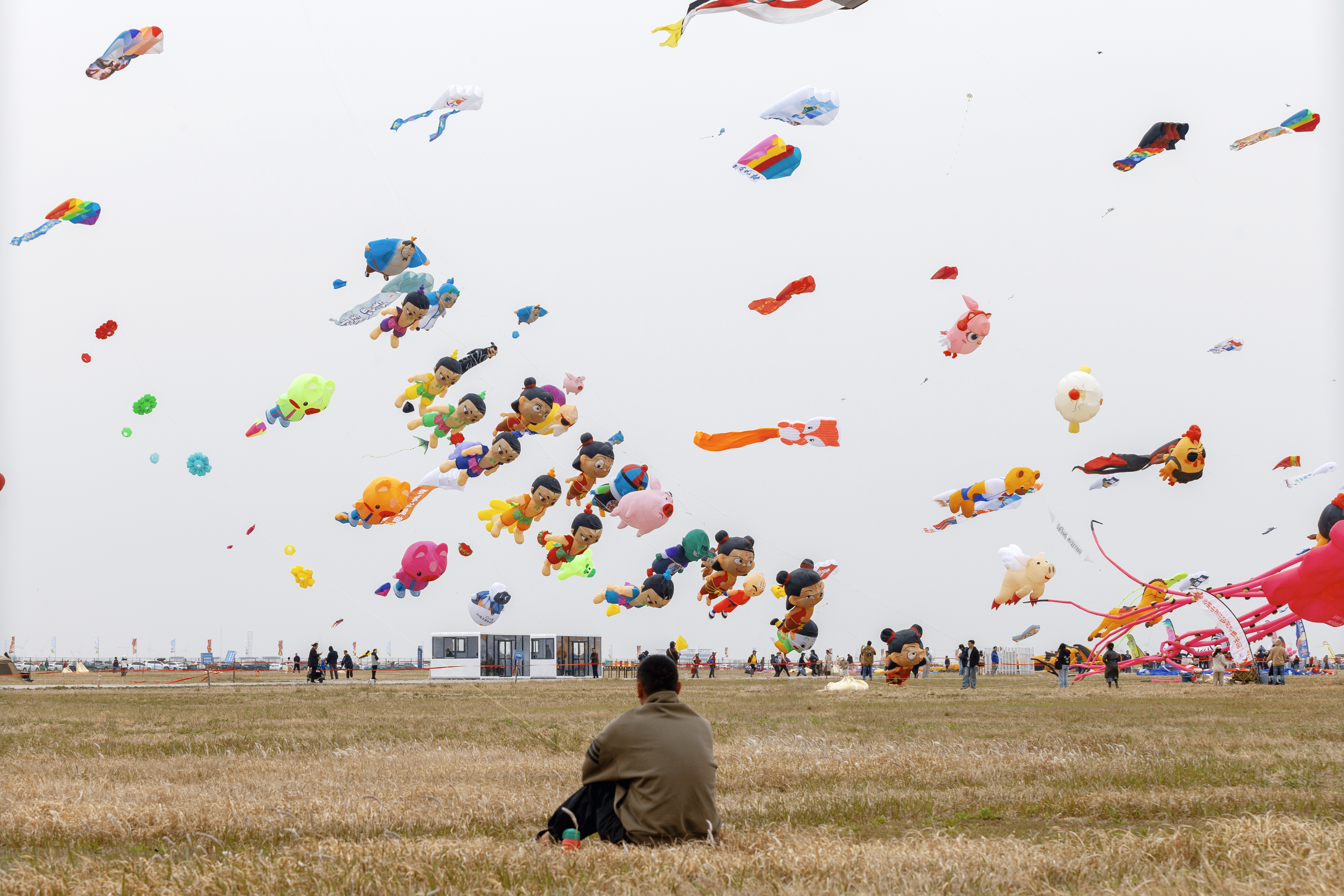 作品拍摄于滨海云门国际放飞场。放飞场上,风筝一个个飞在天空,一个中年人独自坐在场地里,看着远处天空的风筝,像是一个宁静的旅人,守望天空的热闹。