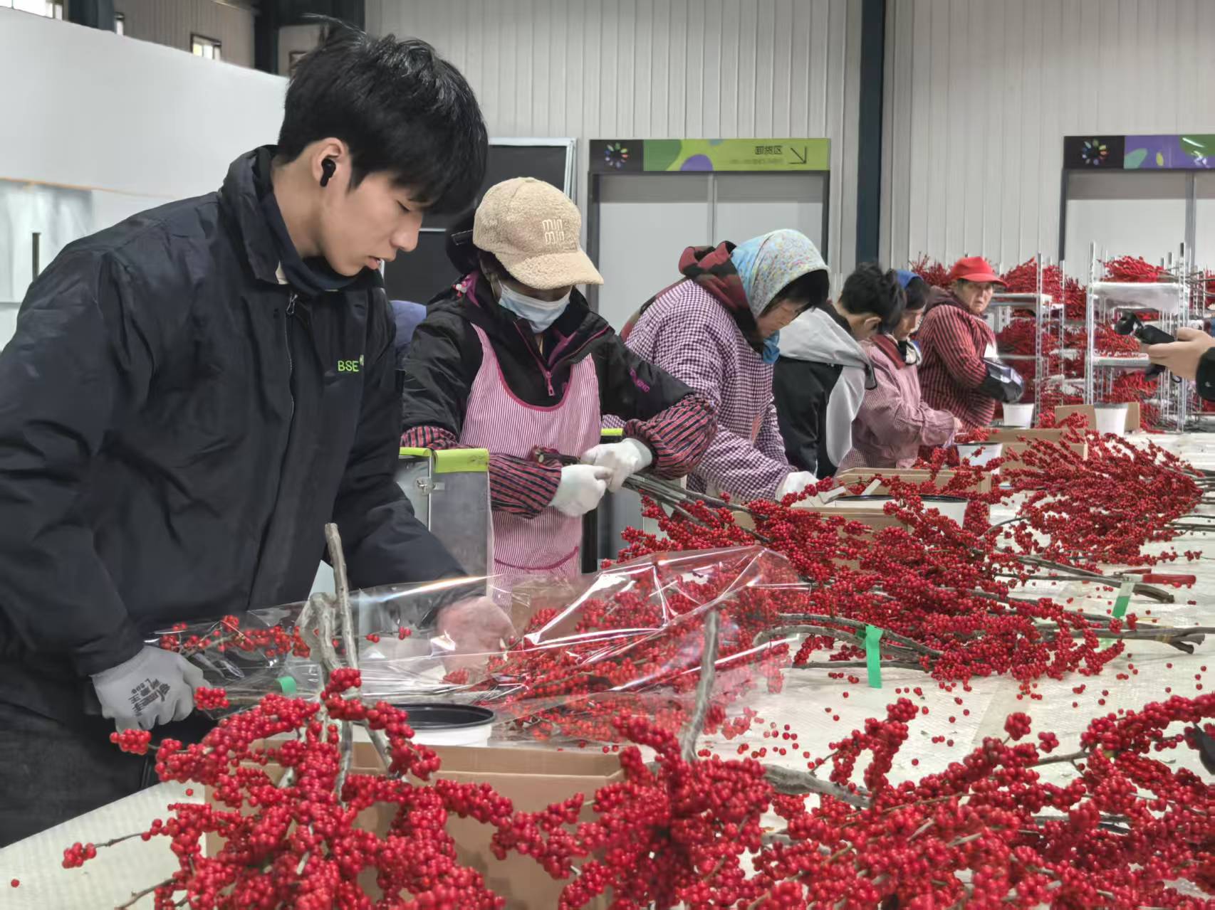 在七彩生态农业产业公园生产车间里,工人们精心筛选出状态最好的北美冬青鲜切枝,仔细打包后,发往全国各地,春节期间将摆进千家万户的桌前。“进口的北美冬青60-80公分长的,一支大约在60到100元,我们的价格可以降低一半。”丛群介绍,目前,全国范围内终端销售的北美冬青,有约七成来自这里。