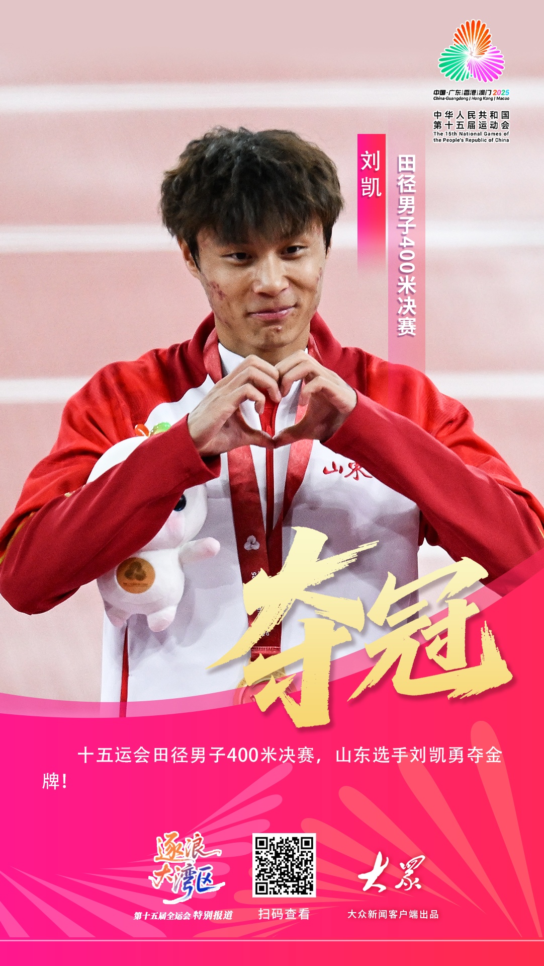 11月18日十五运会田径男子400米决赛山东选手刘凯勇夺金牌大众新闻记者于晓波设计车婷婷