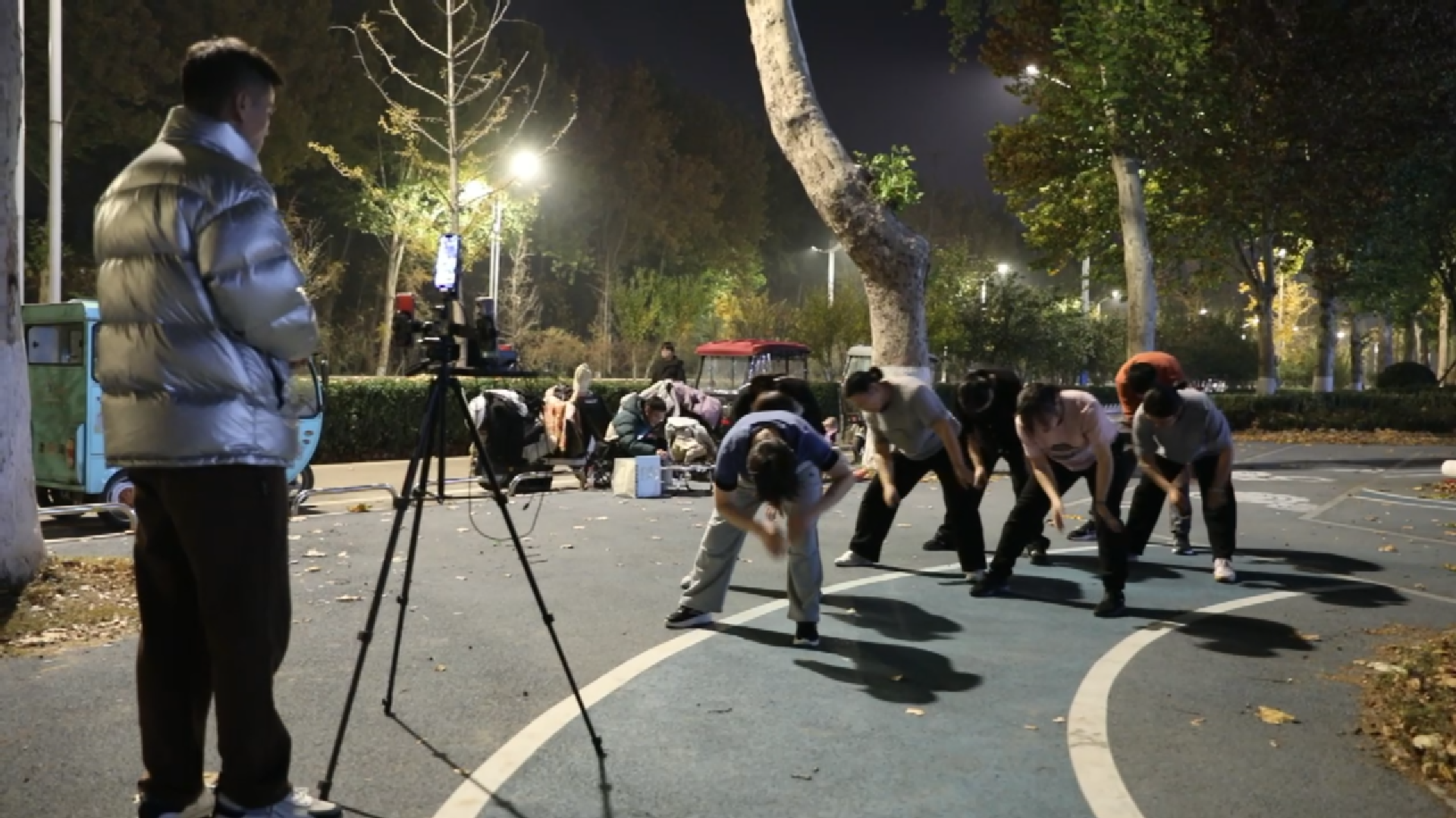 直播开始,随着节奏强劲的音乐他们开始“跳舞”,面无表情,只是简单抬手,伸展双臂,跨步等动作的组合。十几秒的音乐不断重复播放,两秒间歇里,他们放松、深呼吸,随即投入到新的动作轮回。深秋的济南夜间温度7度,40分钟的舞蹈后,他们额发被汗水打湿,站在前排的妈妈时不时低头拿衣服下摆擦脸。
