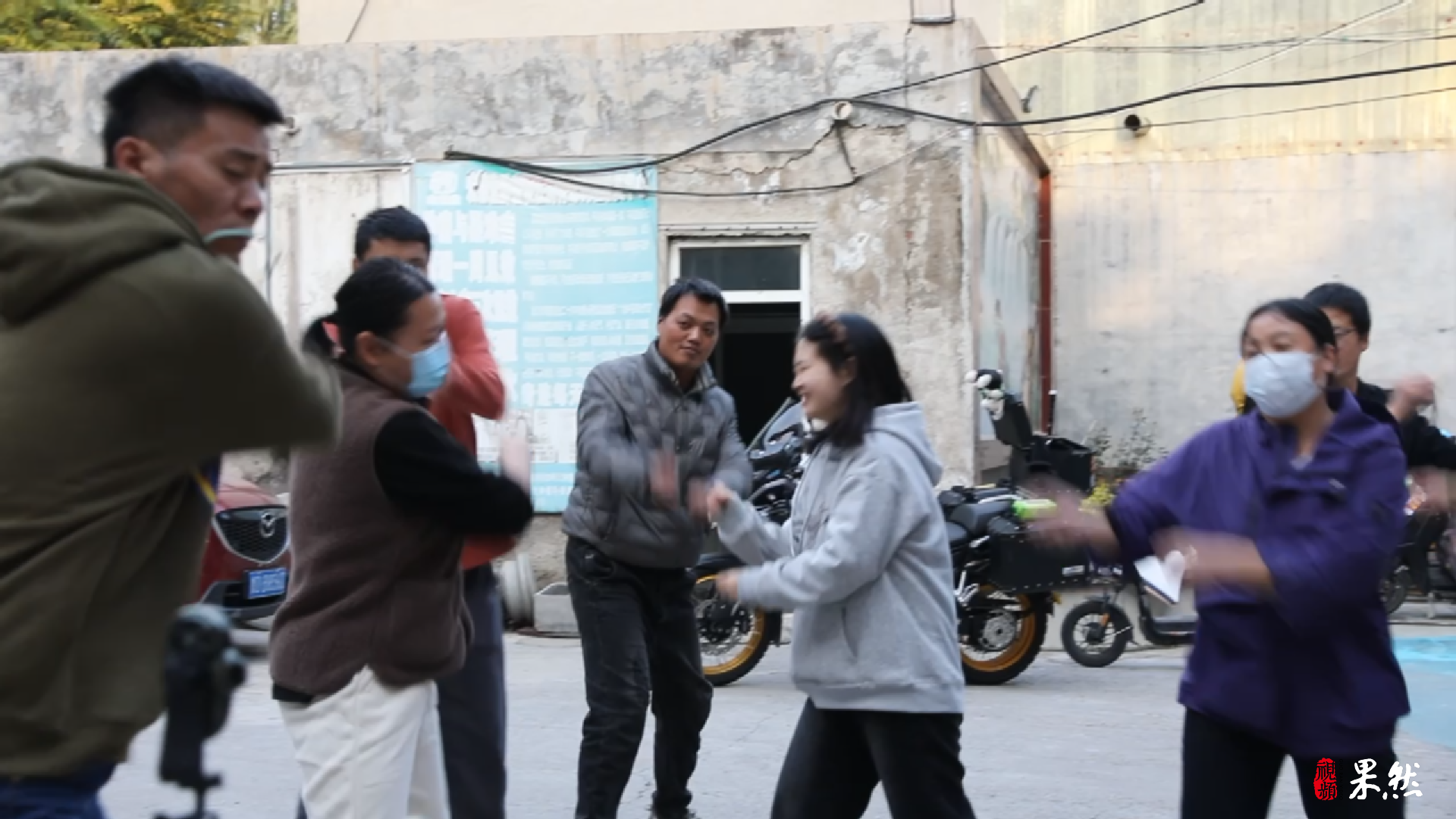 11月12日,山东省肿瘤医院附近的家庭旅馆小院里,聚集着这些跳舞的爸爸妈妈。四层楼高的小旅馆前,停放车辆的间隙就是“练舞室”。