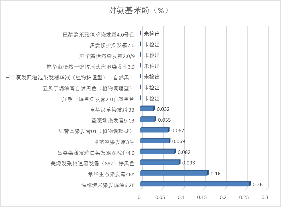 4.检测结果:15款产品中有8款检出对氨基苯酚,含量在0.032%-0.26%之间,均低于《规范》的限值规定,结果见图2。