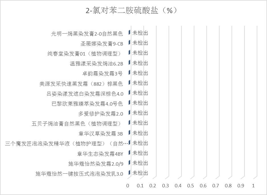 2.检测结果:15款产品中均未检出2-氯对苯二胺硫酸盐,结果见图6。