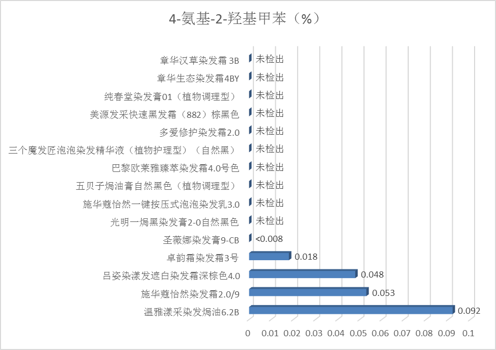 4.检测结果:15款产品中有5款检出4-氨基-2-羟基甲苯,含量在0.008%-0.092%之间,均低于《规范》的限值规定,结果见图10。