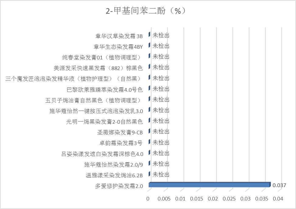 4.检测结果:15款产品中有1款检出2-甲基间苯二酚,含量为0.037%,低于《规范》的限值规定,结果见图11。