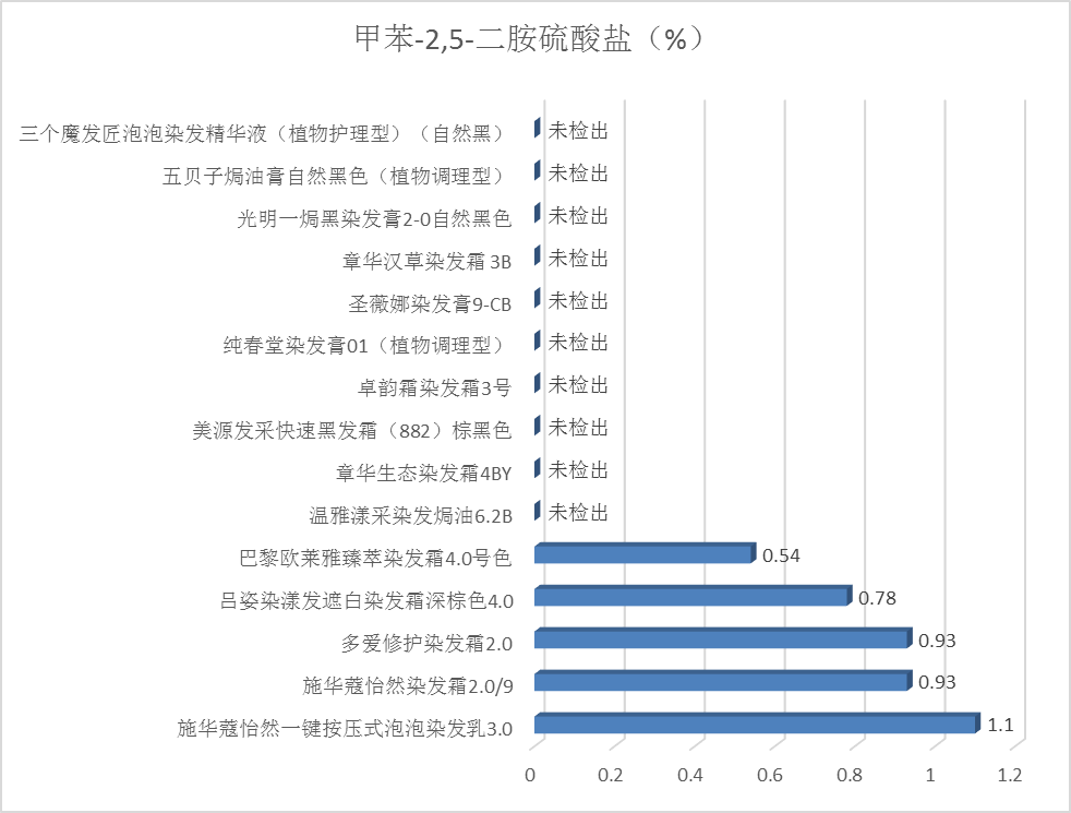 4.检测结果:15款产品中有5款检出甲苯-2,5-二胺硫酸盐,含量在0.54%-1.1%之间,均低于《规范》的限值规定,结果见图3。