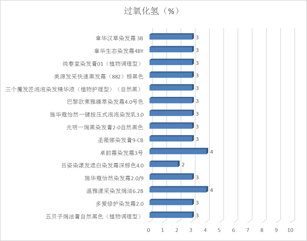 3.最大使用浓度:依据《规范》,过氧化氢在染发产品中的最大使用浓度为12%(以存在或释放的 H2O2计)。