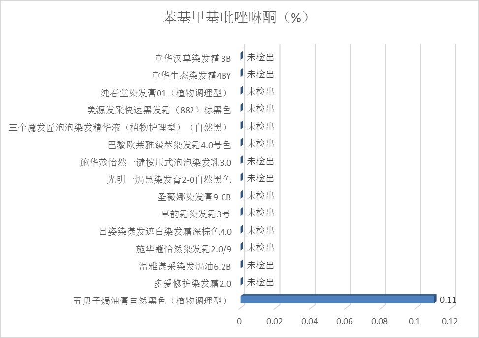 4.检测结果:15款产品中仅有1款检出苯基甲基吡唑啉酮,含量为0.11%,低于《规范》的限值规定,结果见图13。