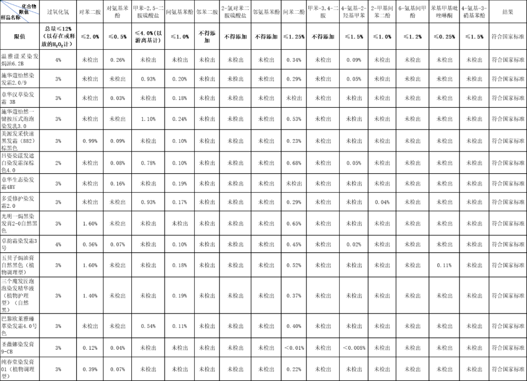 经检测,15款染发类化妆品中所含有的14种染发剂成分和过氧化氢均符合国家标准规定,但不同样品所含有的染发剂成分在类别和含量上各有不同,广大消费者可根据自身需要和关注进行选用。