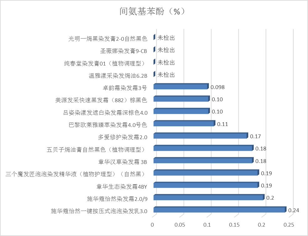 4.检测结果:15款产品中有11款检出间氨基苯酚,含量在0.098%-0.24%之间,均低于《规范》的限值规定,结果见图4。