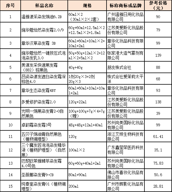 本次比较试验15款样品均在市场销售环节采购。经检验,所有样品均属于我国批准使用的化妆品准用染发剂,有关成分含量均符合国家标准规定。