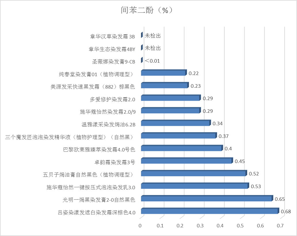 4.检测结果:15款产品中有12款检出间苯二酚,含量在0.22%-0.68%之间,均低于《规范》的限值规定,结果见图8。