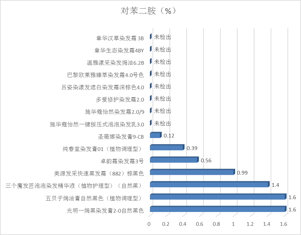 4.检测结果:15款产品中有7款检出对苯二胺,含量在0.12%-1.6%之间,均低于《规范》的限值规定,结果见图1。