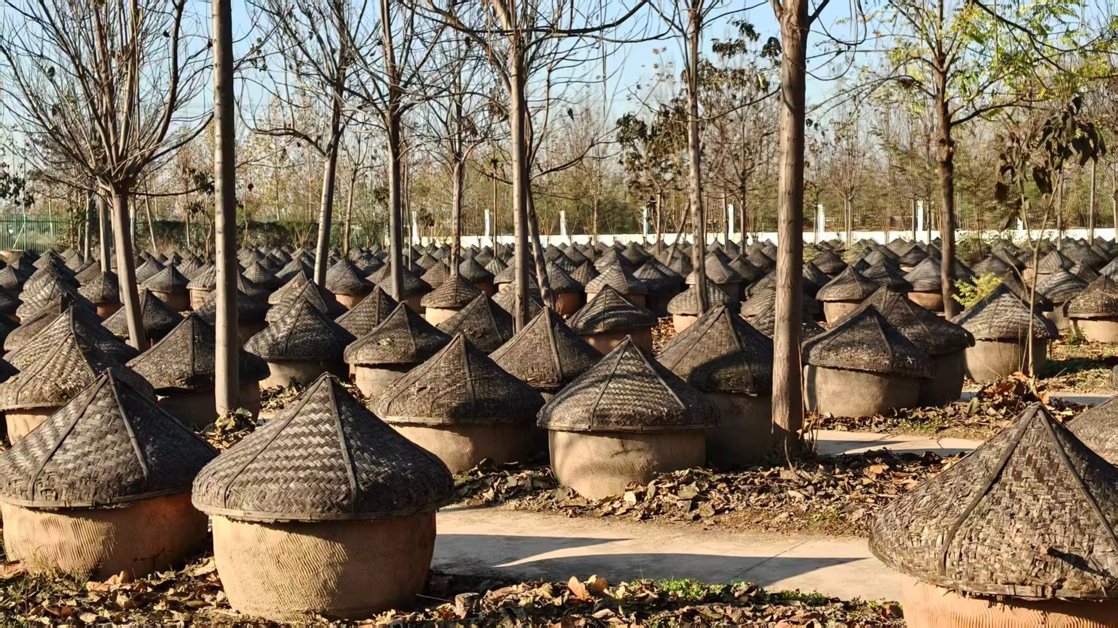 在九女集镇酱菜文化产业园里,上千口陶缸整齐排列在林下,个个顶着草帽,有的装着黝黑的老酱,有的泡着待酱制的芥菜,场面颇为壮观。