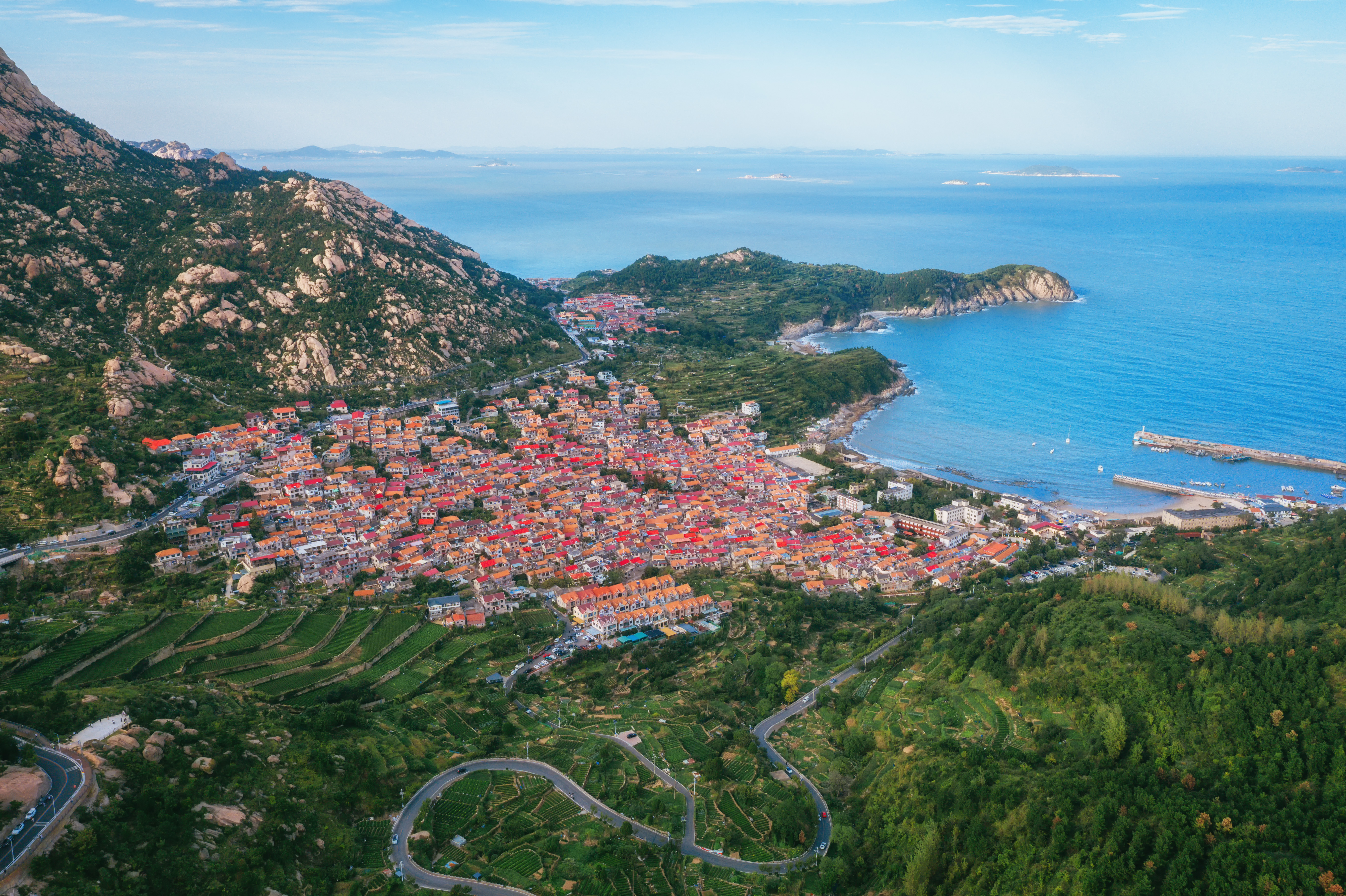 青山裹着斑驳岩峰,翠色漫过层层梯田,红顶的村落像撒在绿毯上的碎珊瑚,顺着蜿蜒公路嵌进海岸的褶皱里。远处碧海漾着蓝绸似的光,白帆、小岛和蜿蜒的码头缀在浪尖,连风里都裹着山的苍劲与海的清润,一眼望去,是把烟火气揉进山海画卷里的鲜活与舒展。 作品展现了现代渔乡之美。
