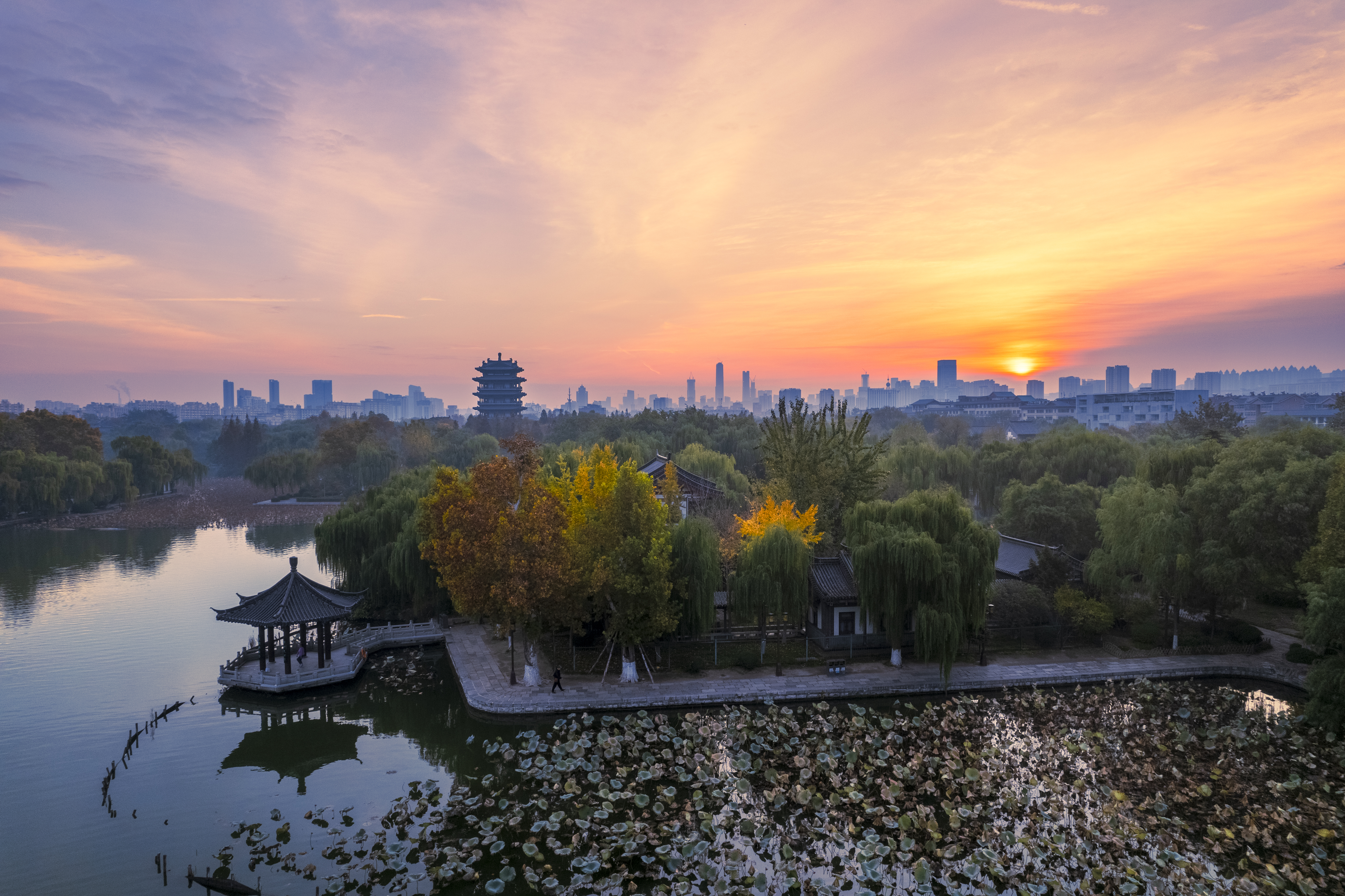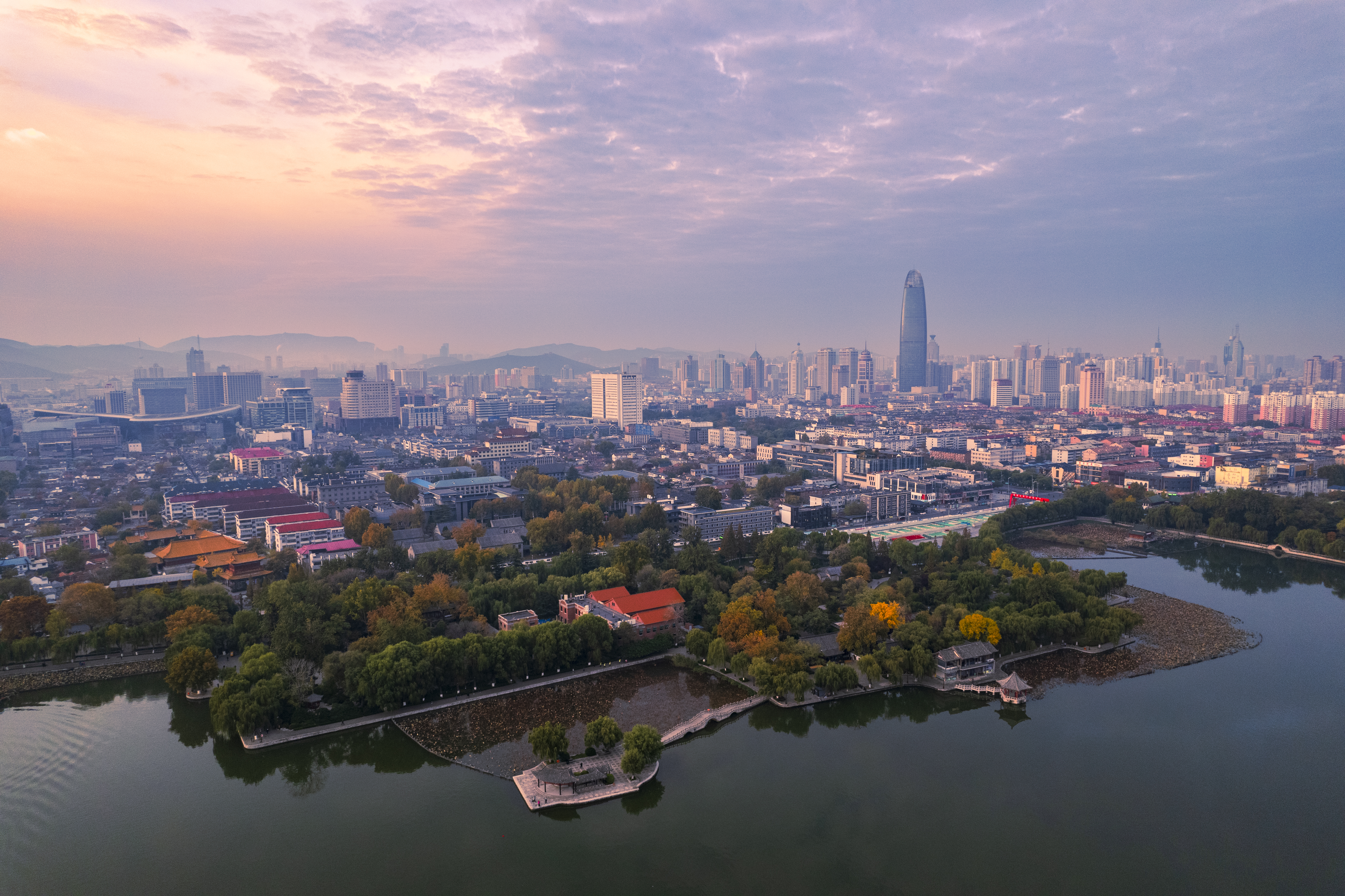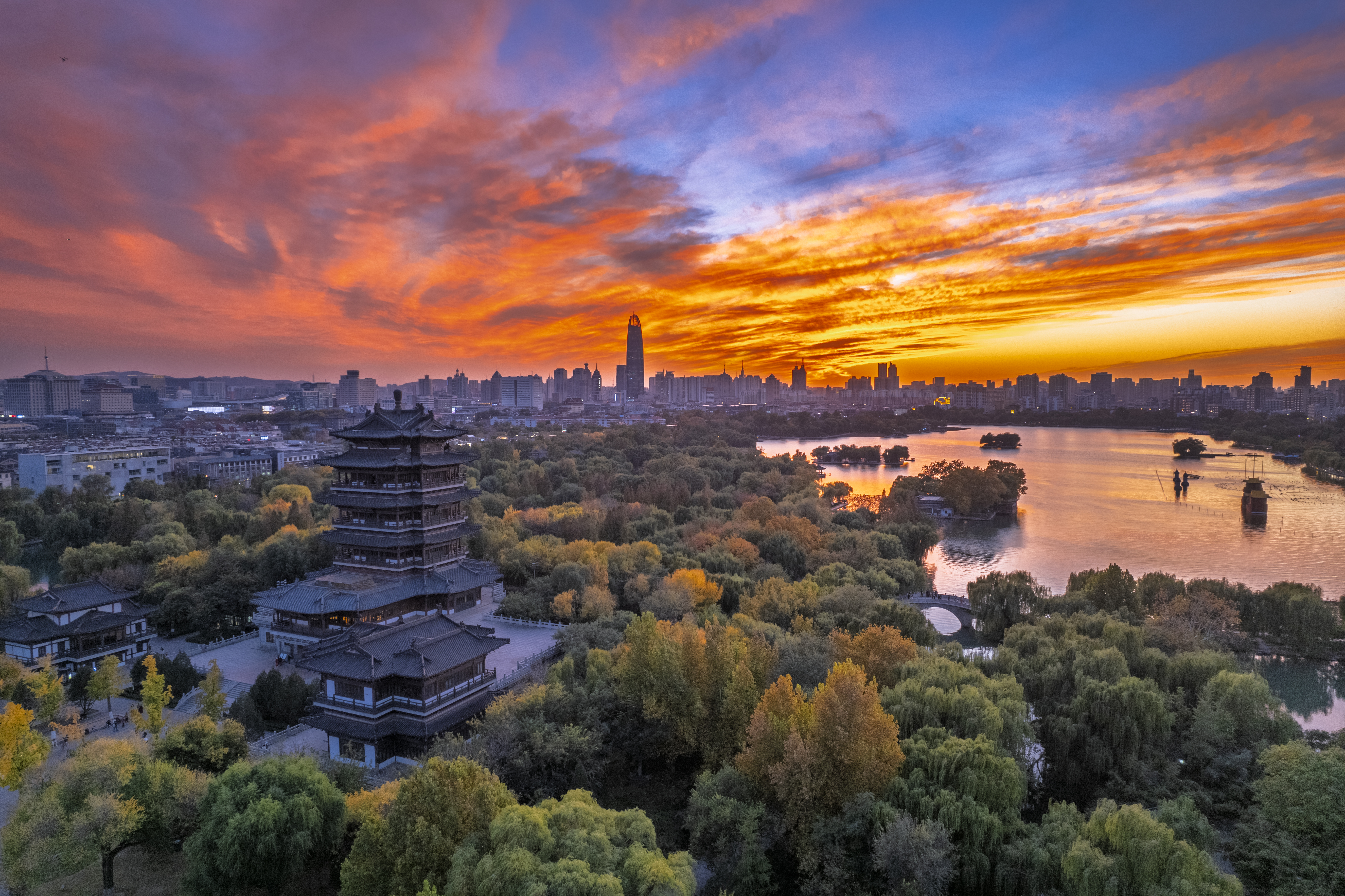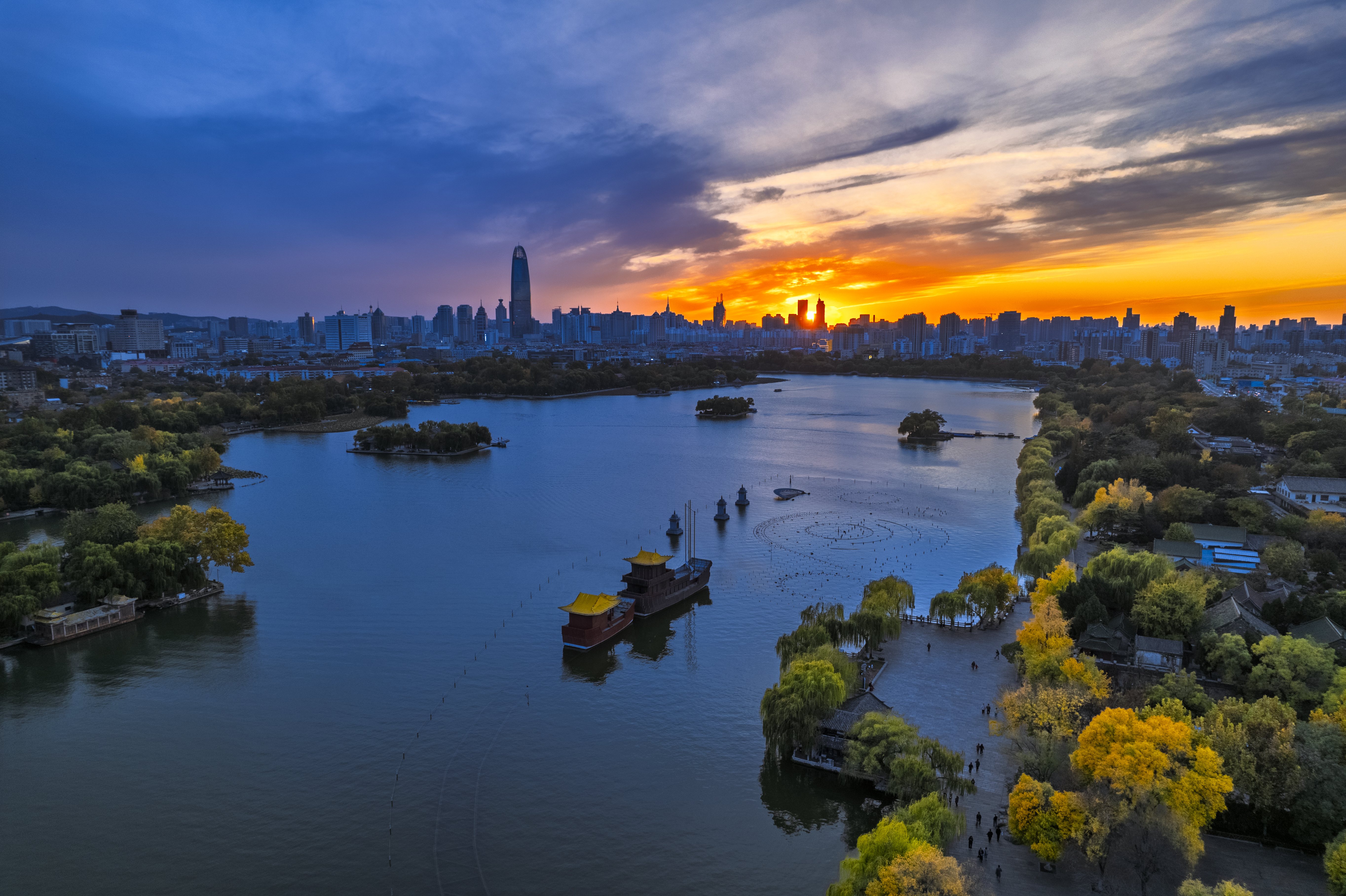 入秋,大明湖被染成了金黄色。从空中俯瞰,霞光映照,大明湖更显魅力。