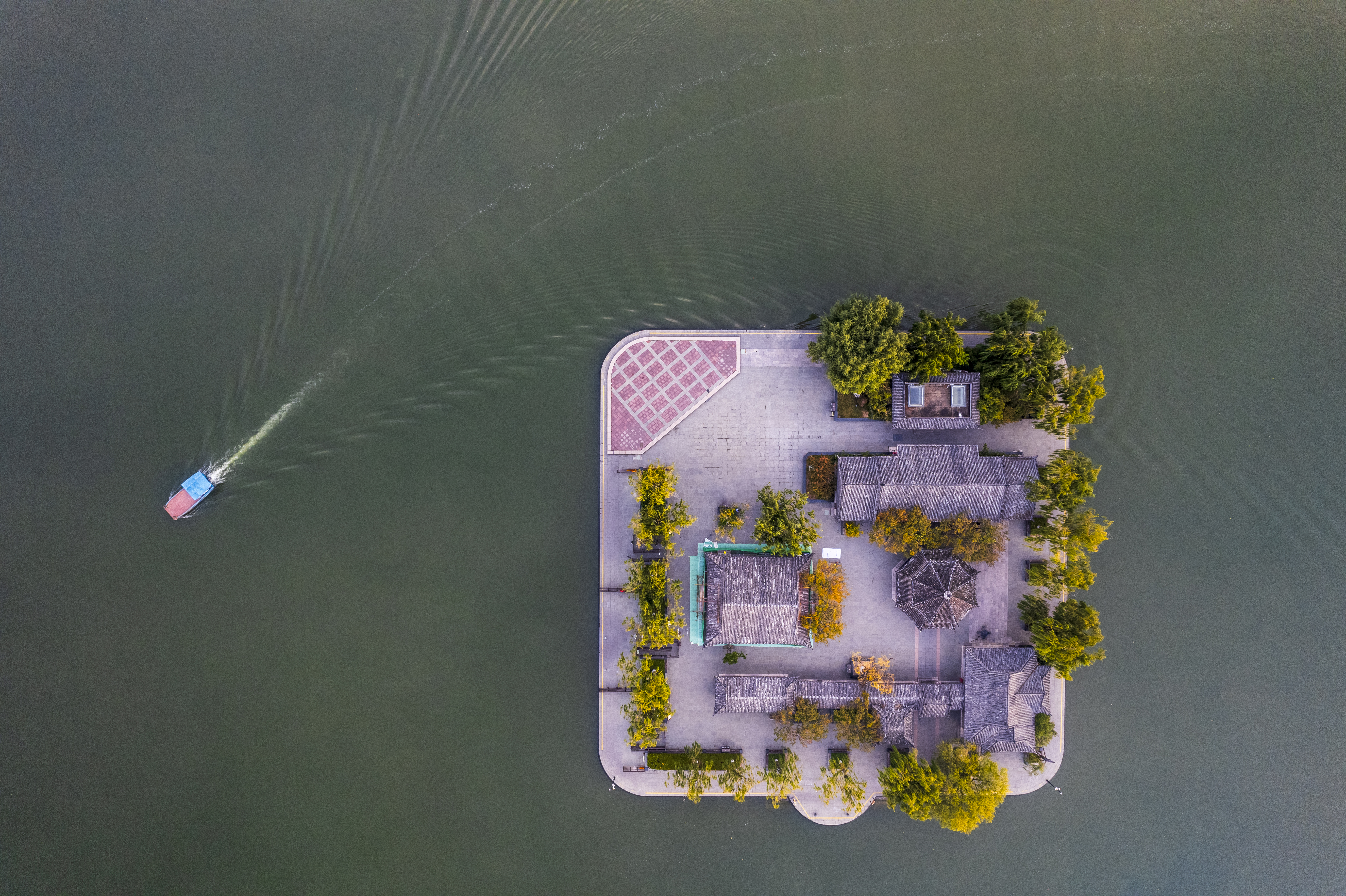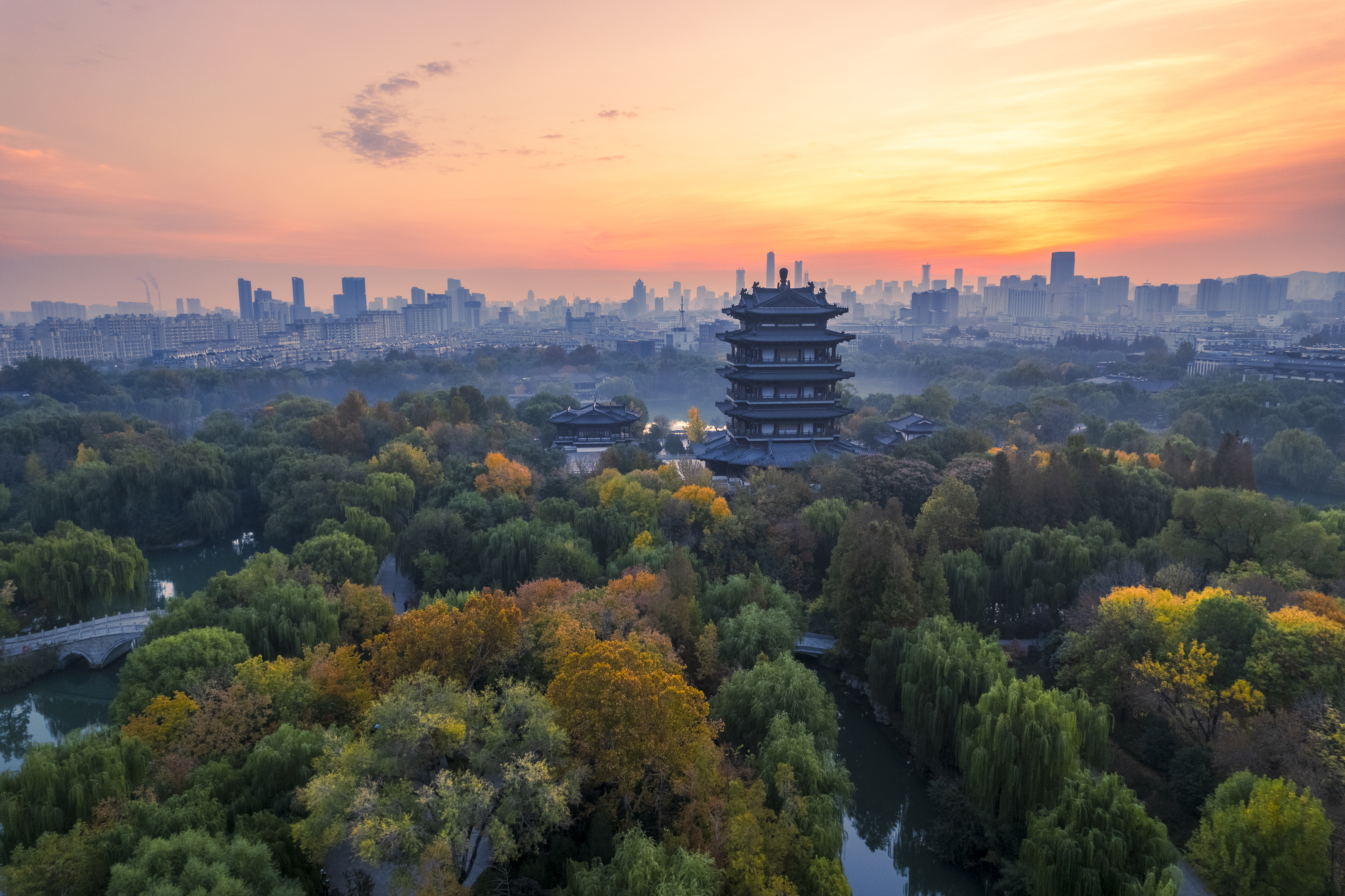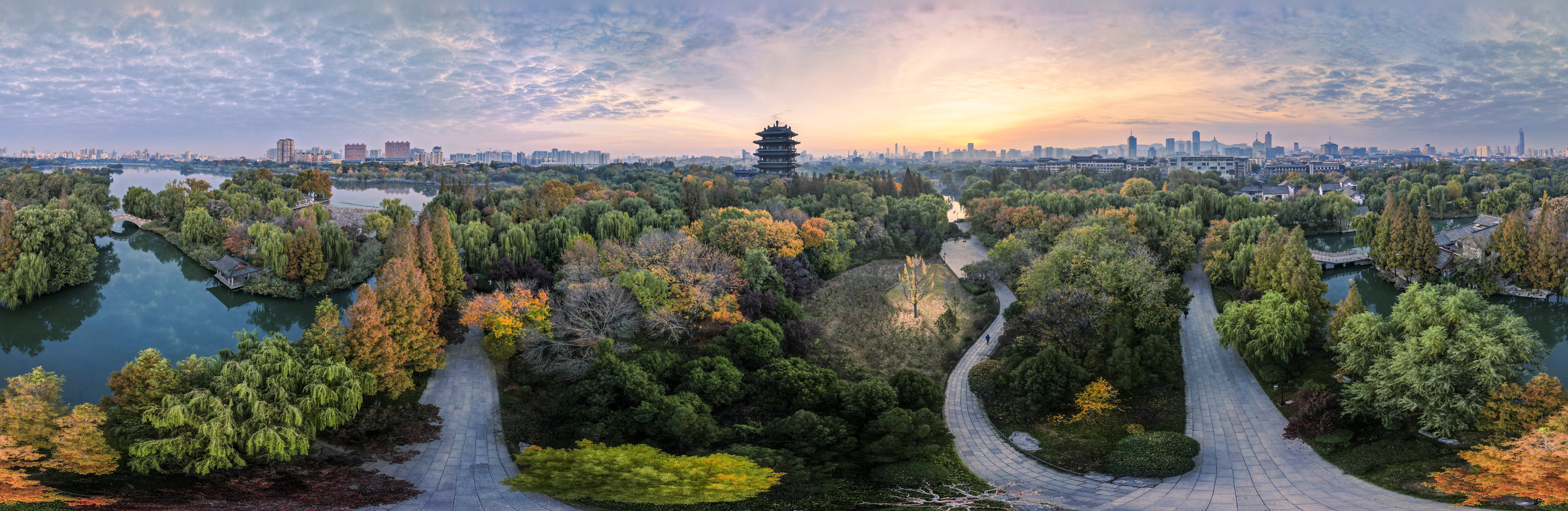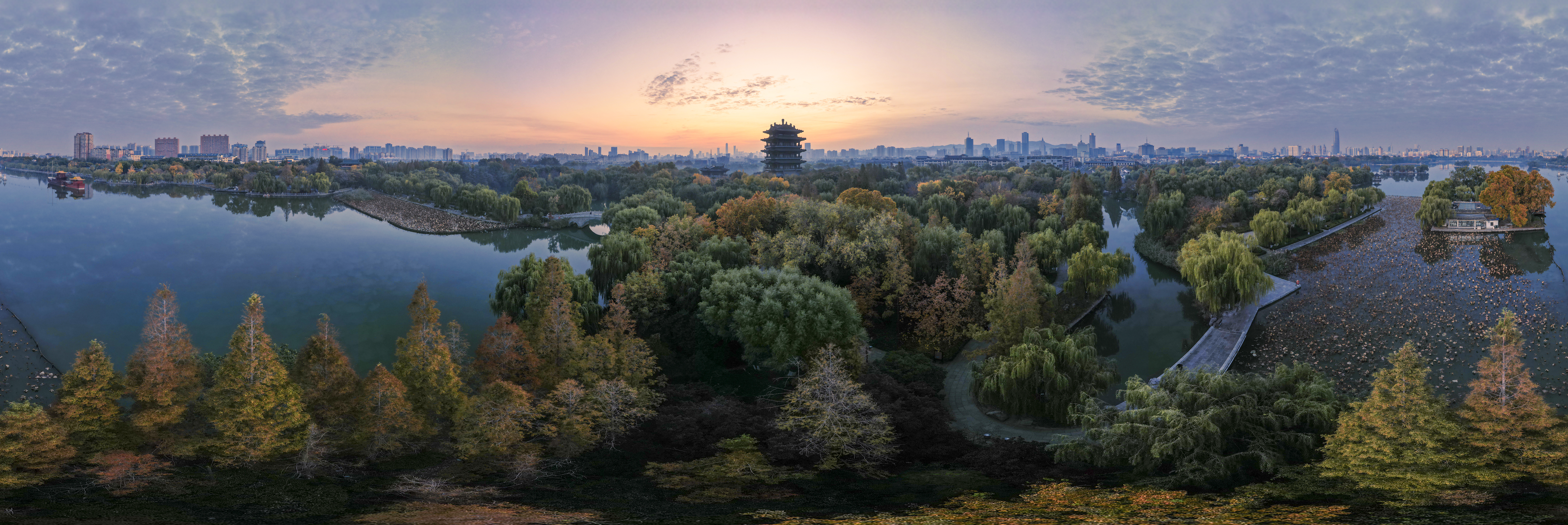 入秋,大明湖被染成了金黄色。从空中俯瞰,霞光映照,大明湖更显魅力。