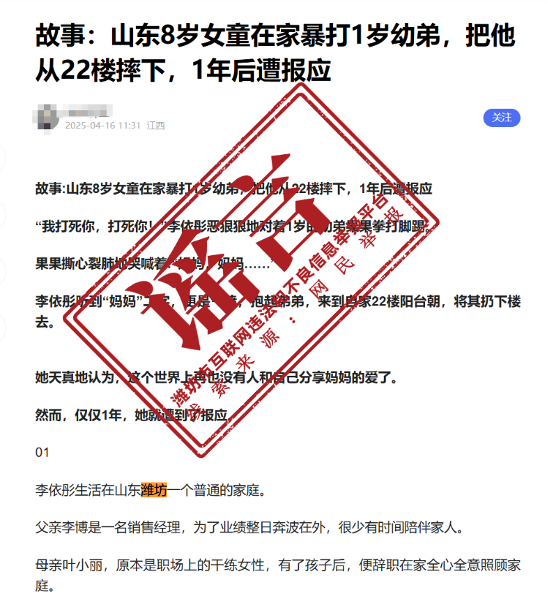 “潍坊八岁女童将幼弟从22楼摔下”事件系谣言