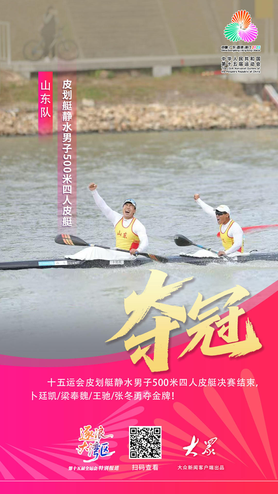 11月20日,十五运会皮划艇静水男子500米四人皮艇决赛结束,山东队(卜廷凯/梁奉魏/王驰/张冬)勇夺金牌。
