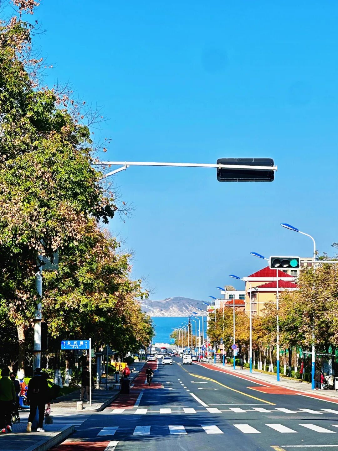 漫步北山街,路旁的栾树褪去了夏日的葱茏,叶片染成了极温润的黄,边缘还泛着淡淡的焦糖色光晕,风一吹便簌簌轻摇,将冬日的阳光筛成点点暖光,斑驳地洒落在路面上。相较于夏日的热闹,冬日的街道更显静谧,海风送来海浪拍岸的浑厚声响,偶尔有海鸥低空掠过,为这幅冬日画卷添上灵动一笔。