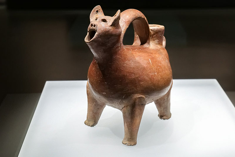 出土于泰安大汶口遗址。高21.6厘米,夹砂红陶,通体磨光,遍施红色陶衣,光润亮泽。器型圆面耸耳,拱鼻,张口,耳穿小孔,四肢粗壮,短尾上翘,背装弧形提手,尾根部一筒形注水口,嘴可往外倒水,腹部鼓起加大了容积,四足立起可供加热,使用方便,造型生动美观,逗人喜爱,集实用与仿生艺术于一身,是大汶口文化独有的器形,充满了创造性的灵感,是新石器时代一件难得的陶器珍品。