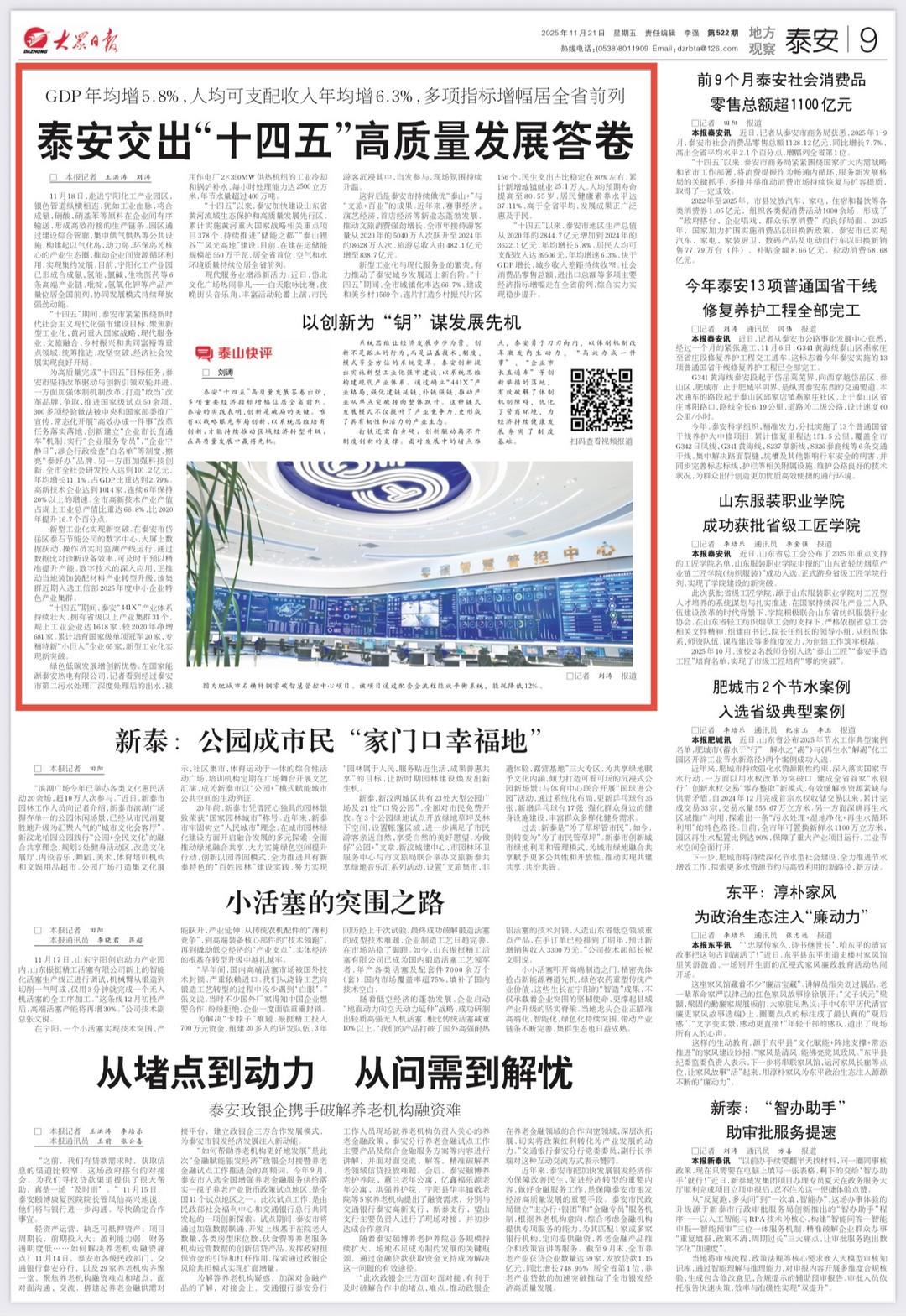 11月21日,大众日报《泰安新闻》推出重磅策划“聚焦泰安高质量发展”,刊发《泰安交出“十四五”高质量发展答卷》,报道“十四五”时期,泰安市紧紧围绕新时代社会主义现代化强市建设目标,聚焦新型工业化、黄河重大国家战略、现代服务业、文旅融合、乡村振兴和共同富裕等重点领域,统筹推进,攻坚突破,经济社会发展呈现良好态势。详情请点击这里——