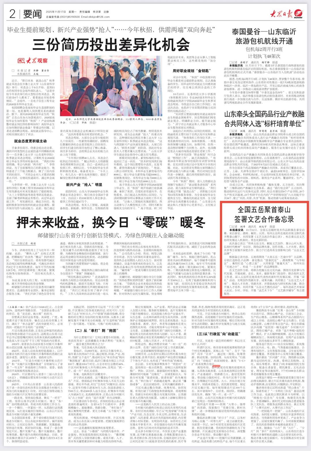 11月17日,2版要闻刊发《全国五岳聚首泰山签署文艺合作备忘录》,报道全国五岳齐聚泰山脚下,共同签署《文艺交流合作备忘录》,标志着五岳文艺协同发展迈入机制化、常态化新阶段。详情请点击这里——