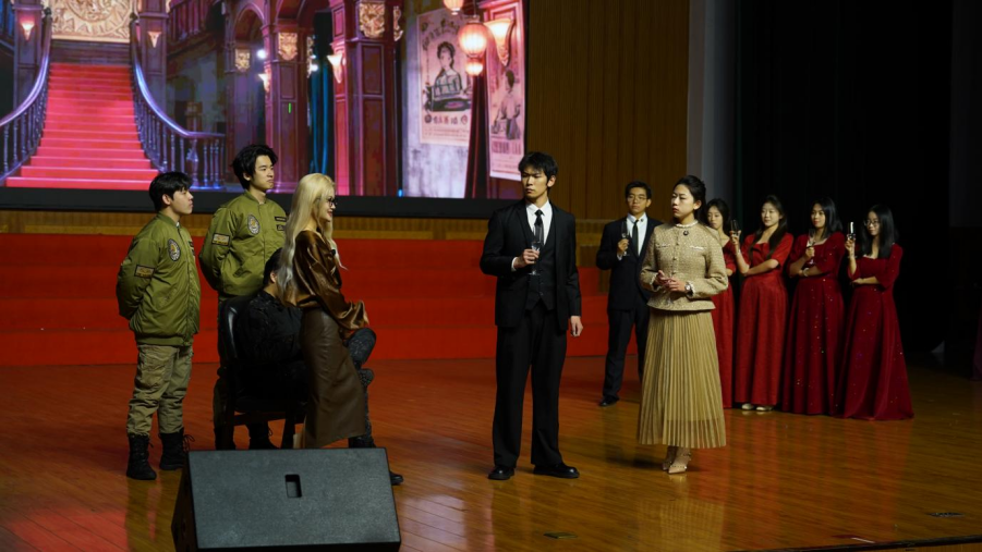 为推进该项目落地,学校于10月初组建项目团队,选取有音乐剧表演、文艺演出指导等经验的老师组成导演组,面向全体在校生海选演员,仅主角竞选就吸引200余人参与,最终确定3名主演及60余人团队(含 30余名演职人员)。演员们通过观看影视资料、研读传记等揣摩角色;为更好地烘托主角形象,导演组特意加入了一些配角。在集体协作和艰苦排练中,剧目呈现张力、项目组项目推进能力全面提升,为剧目落成首演和基地成立奠定了良好基础。