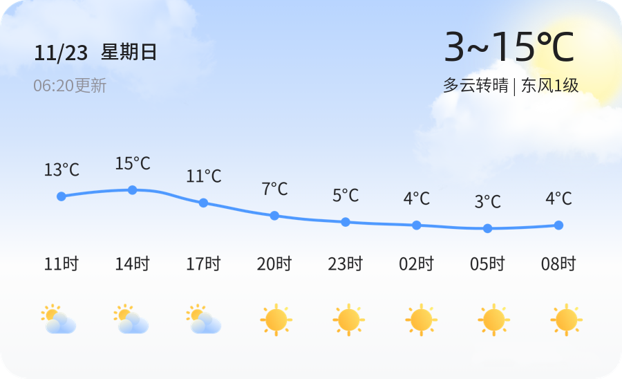 今天是11月23日,星期日,农历十月初四。潍坊市今日天气为多云转晴,气温介于3℃至15℃之间,东风1级,空气湿度66%。当前空气质量状况为轻度污染(PM2.5浓度为125)。市民在户外活动时建议佩戴口罩,敏感人群应尽量减少外出。出行时请注意保暖,适时增减衣物,以应对气温变化带来的不适。
