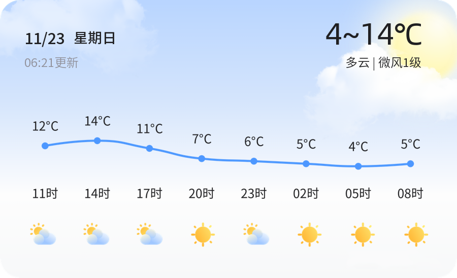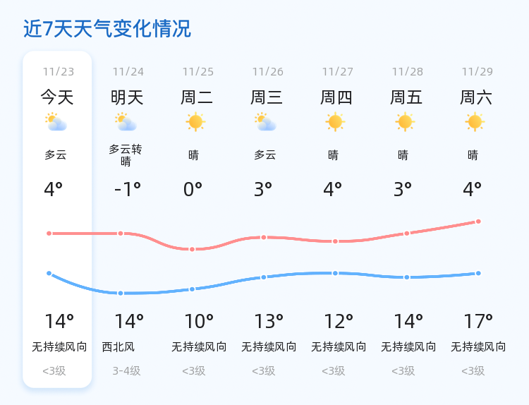 今天是11月23日,农历十月初四,济宁市迎来多云天气。气温方面,今日最高气温14℃,最低气温4℃,当前温度为9℃,风力微风1级,空气湿度59%,PM2.5指数80,空气质量良好。全市各区天气情况基本一致,均为多云,市民朋友们可以正常进行户外活动,但需注意适时增减衣物。 明天济宁天气将由多云转为晴朗,气温有所下降,最低气温-1℃,最高气温仍为14℃。风力将有所增强,西北风3-4级,相比今日的微风天气,市民出行时需注意防范大风影响,尤其是骑自行车或电动车的市民,建议减速慢行,确保安全。 未来三天,济宁市天气将以晴到多云为主,气温波动较大。预计最低气温将降至-1℃,最高气温则维持在14℃左右。在此提醒市民朋友,早晚温差较大,出行时务必做好保暖措施,特别是老年人和儿童,应避免在气温较低时段长时间逗留在户外。此外,未来三天内可能出现大风天气,市民应提前做好防范准备,确保人身和财产安全。 温馨提示