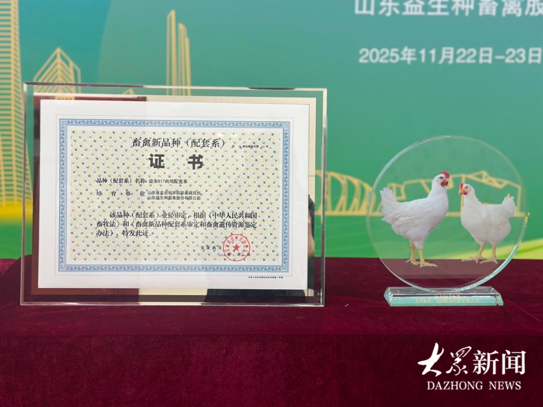 2025年7月31日,由山东省农业科学院家禽研究所和山东益生种畜禽股份有限公司联合培育的“益生817”肉鸡获得国家新品种证书,这标志着817肉鸡实现了从“制种技术”到“国审品种”的历史性跨越。由省农科院家禽所首创的817肉鸡制种模式,开辟了我国肉鸡产业的小型白羽肉鸡新赛道,引领了独具中国特色的小型白羽肉鸡产业稳步发展,是振兴民族种业的一大创举。