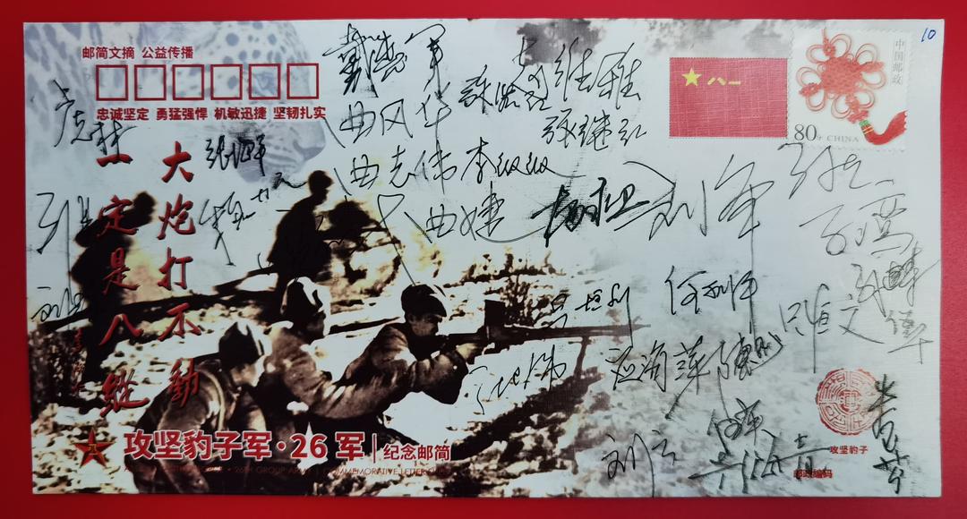 据介绍,第26集团军的前身是华东野战军第8纵队,该部队在华东野战军中善打硬仗,作风勇猛、顽强,被赞具有豹子精神,被誉为“能攻善守豹子军”。因此,由国防大学原副政委李殿仁中将题写的“大炮打不动,一定是八纵”这句话,也印在了这封邮简的首页位置。