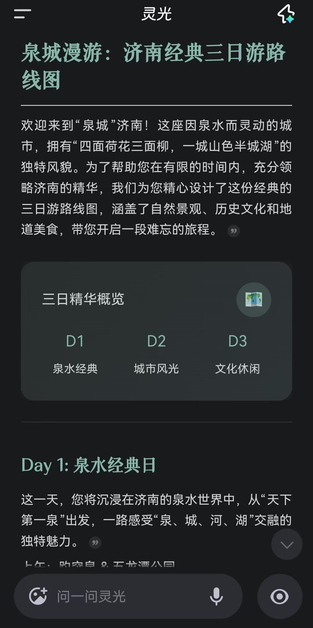下周计划带孩子进行3天济南亲子游,只需对着APP随口说:“帮我规划3天济南亲子游,避开拥挤景点,包含适合4岁孩子的互动项目和亲子餐厅”。不到30秒,一份结构化的完整攻略便生成了,不仅划分了经典游玩和快捷游玩两种模式,还以图文结合的形式呈现,包含可交互地图、景点信息卡片和美食推荐表格,视觉呈现远超传统文字攻略。经典模式里,从的最佳趵突泉游览时段,合理避开人流,到山东省科技馆的提前预约门票技巧,再到泉城路附近的亲子餐厅推荐,细节细致到地铁口编号和步行路线时长。快捷模式则聚焦核心景点,压缩换乘时间,比如将千佛山和山东大学安排在同一时段,推荐乘坐索道下山,既节省体力又不耽误观景,特别适合带娃出行。