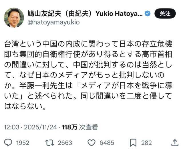日本前首相鸠山由纪夫24日就高市早苗错误言论再次发文称:“对于高市首相所说的,台湾这一涉及中国内政的问题会导致日本进入‘存亡危机事态’、从而可能行使集体自卫权这一错误观点,中国提出批评是理所当然的。”详情>>