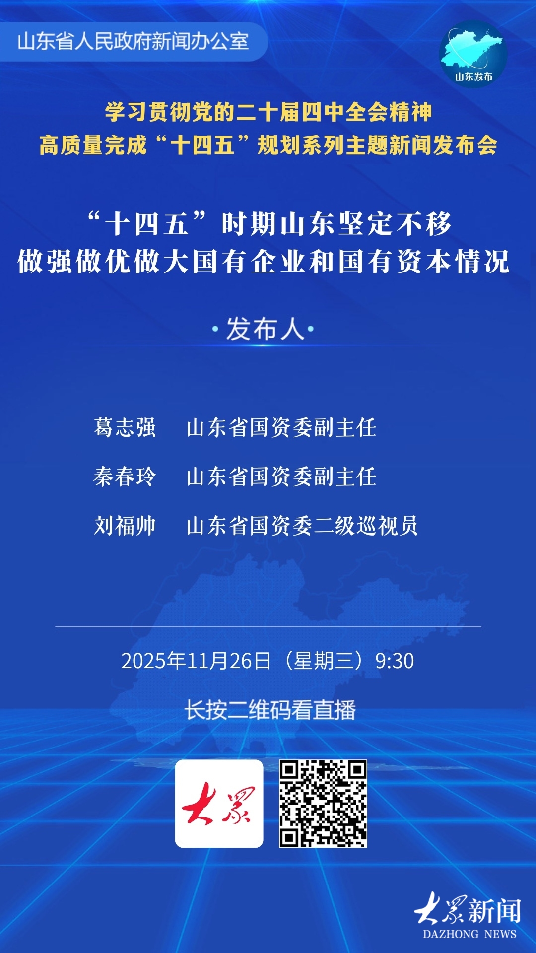 省政府新闻办定于11月26日(周三)上午9:30举行省政府新闻办新闻发布会,邀请省国资委负责同志等介绍“十四五”时期山东坚定不移做强做优做大国有企业和国有资本情况。